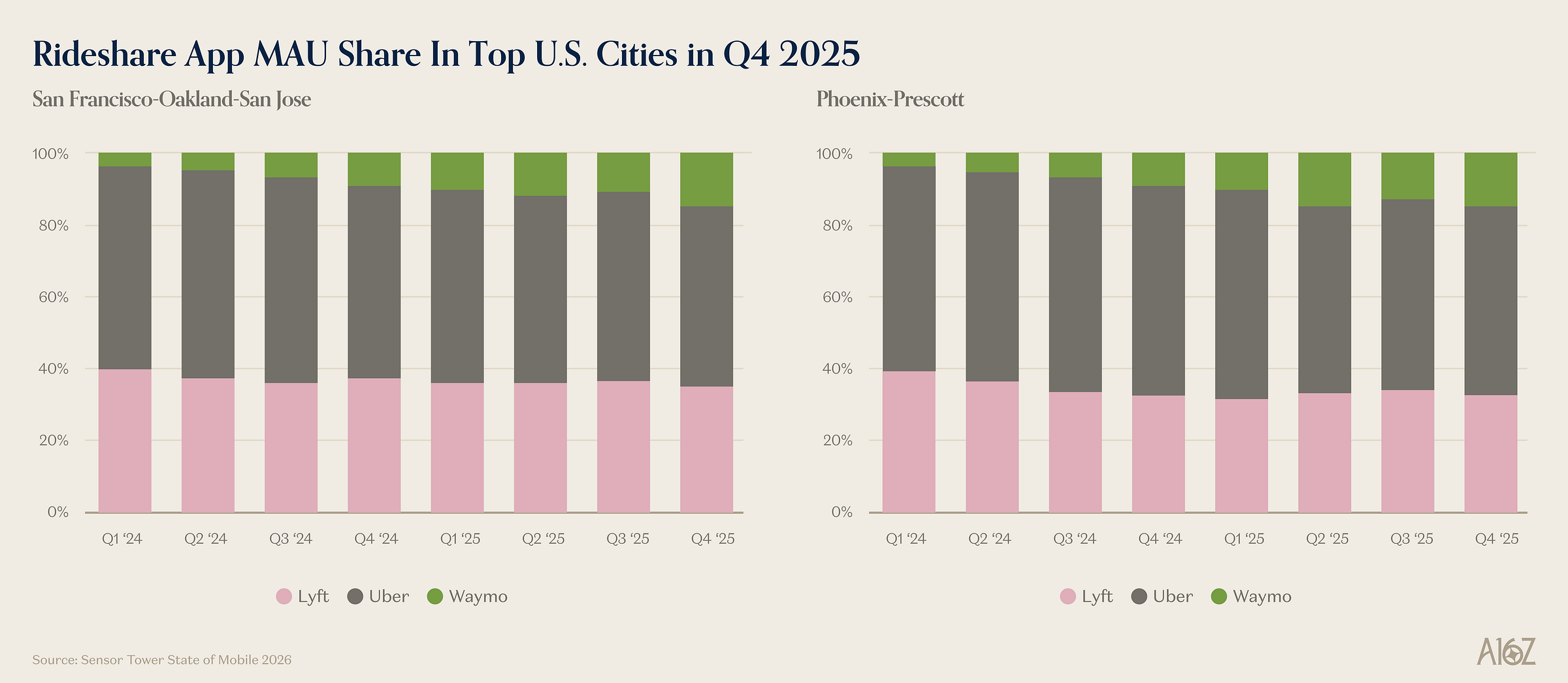 Waymo’s share of rideshare MAUs has risen to ~15% in SF and Phoenix, despite operating in only parts of those cities.