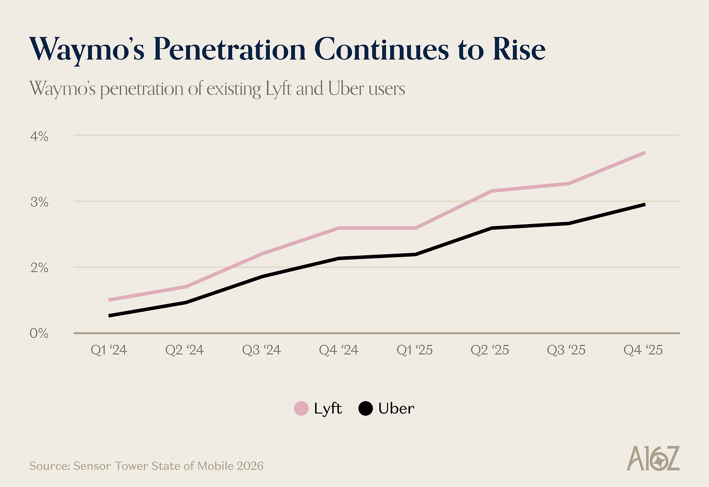 As of Q4, Waymo’s penetration of Lyft and Uber’s userbase has steadily risen to ~4% and 3% respectively.