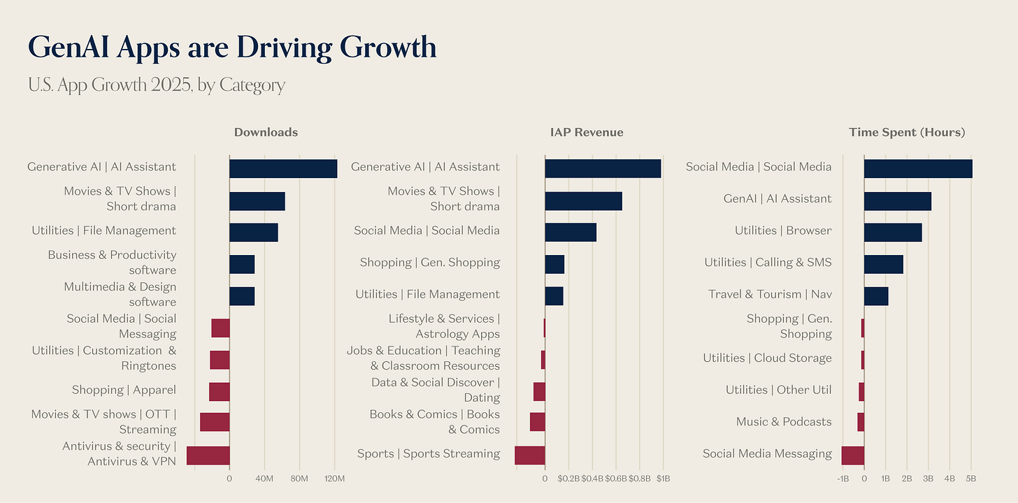GenAI apps added the most downloads, the most In-App Purchase revenue, and the second most time-spent (after social media).