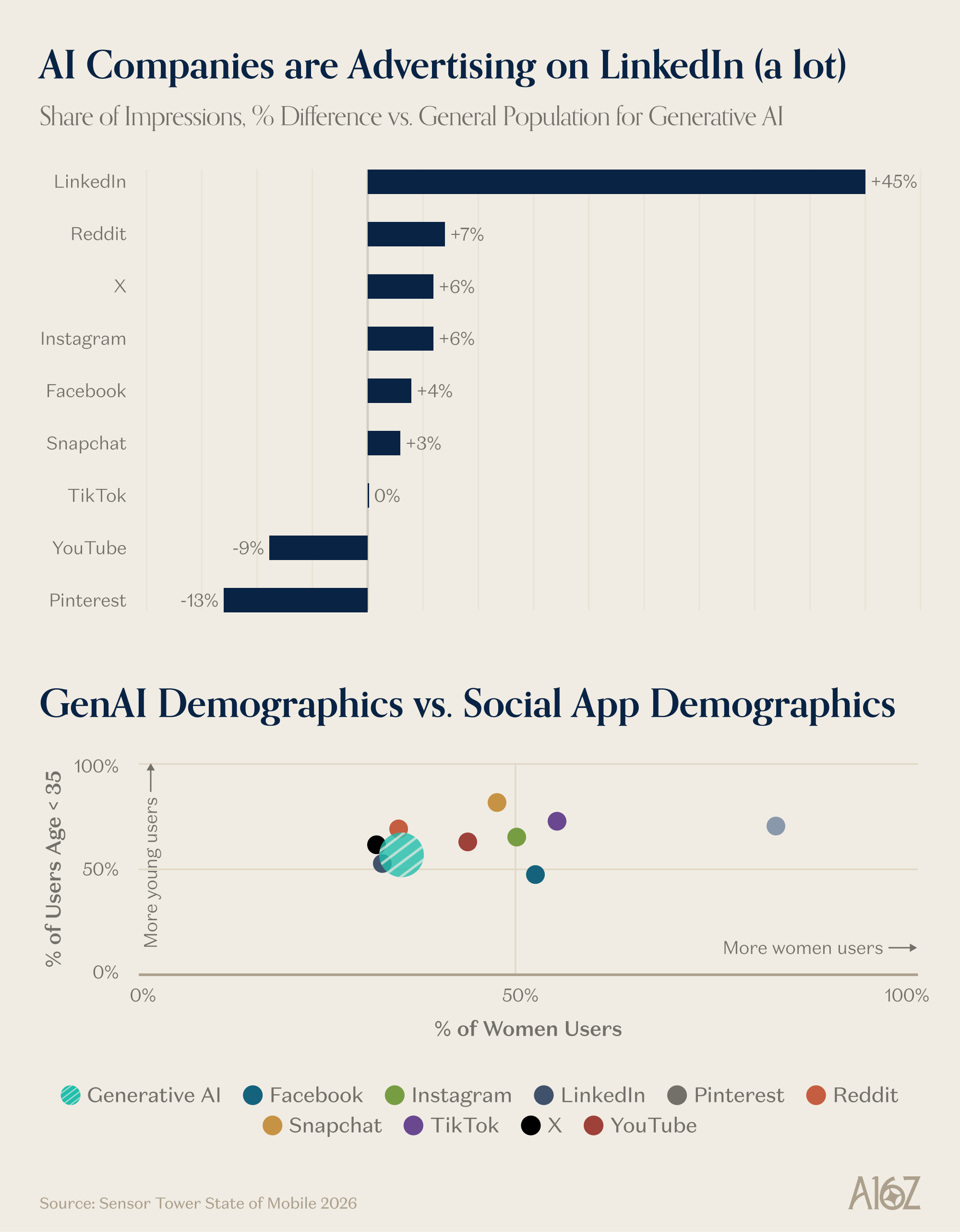 Well, one possibility (as per the chart) is that GenAI skews younger and male, and so does LinkedIn (and Reddit and X). Go where your audience is, etc. etc. Plus, the race for the Enterprise/Business-User is still very much on, and perhaps LinkedIn is the considered the place to find them.