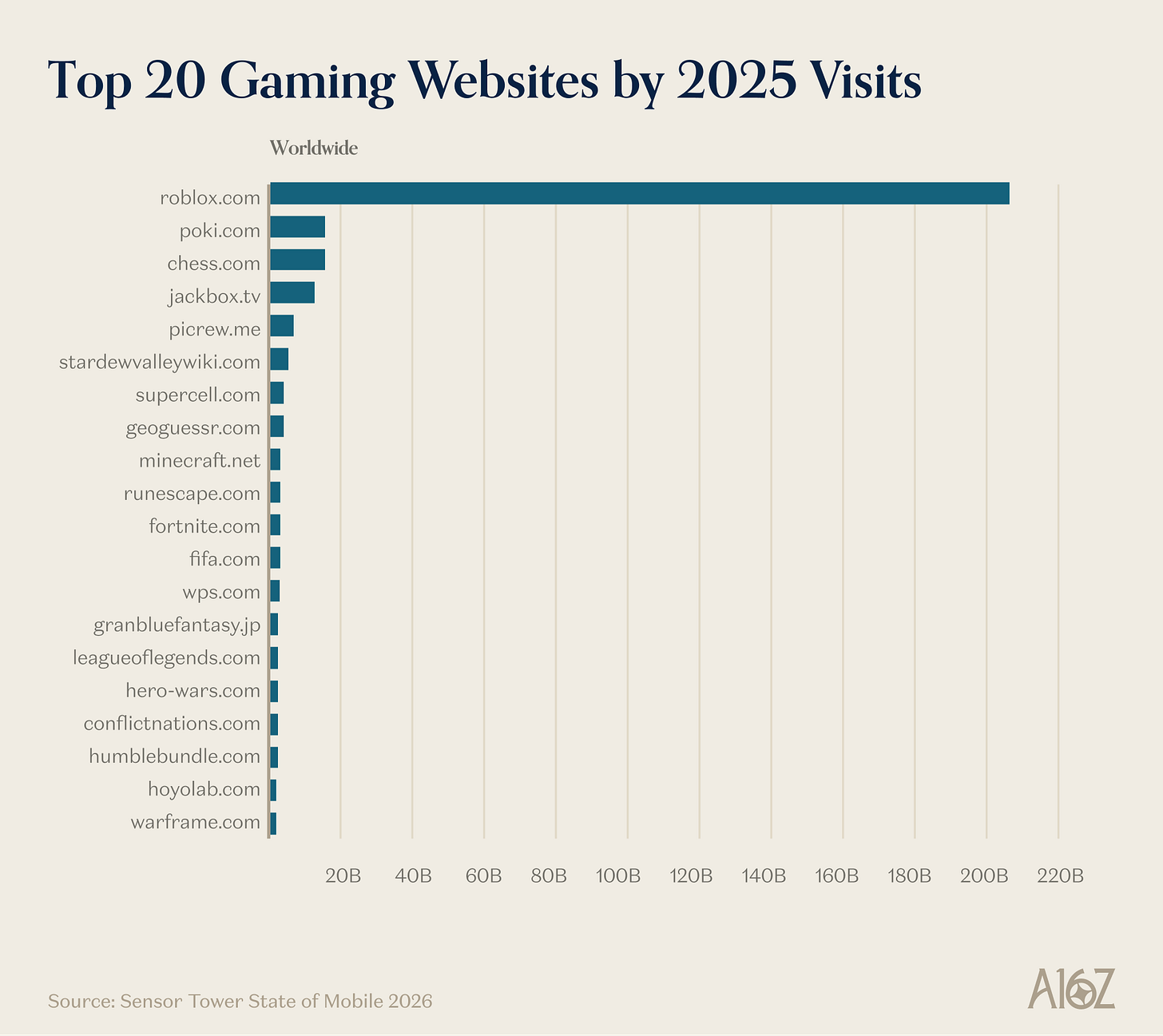 Roblox is the undisputed global champ of site visits, capturing ~75% of all visits to game publisher sites.