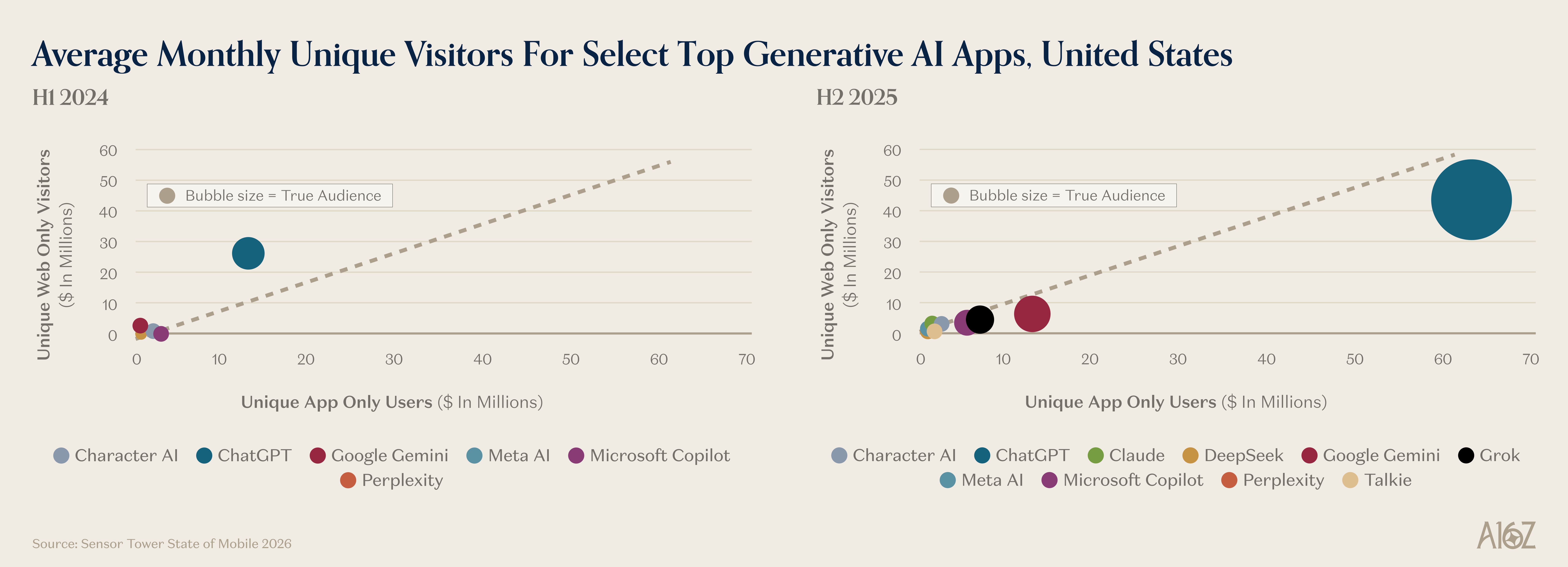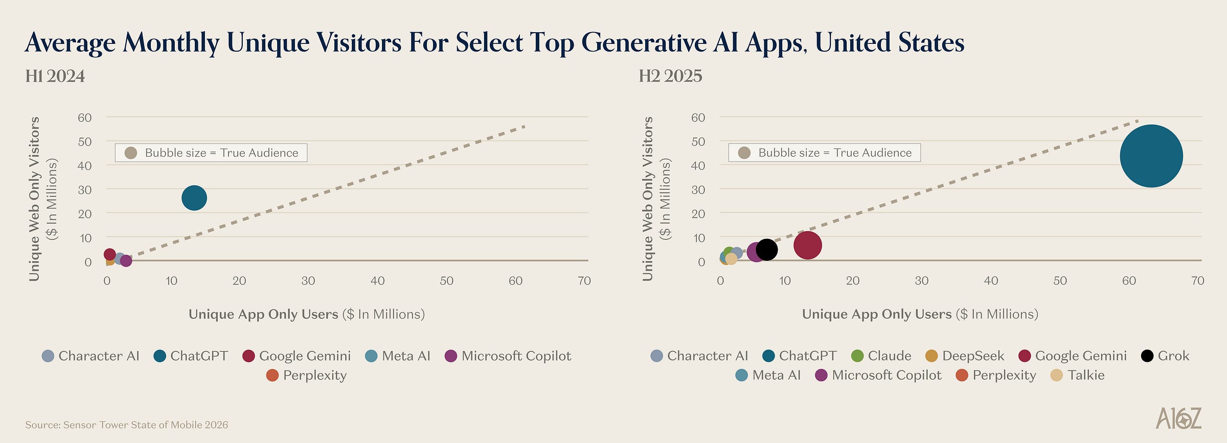 To get a sense of how quickly GenAI app usage is growing, consider the change in audience size for GenAI apps from the first half of ‘24 to the second-half of ‘25.
