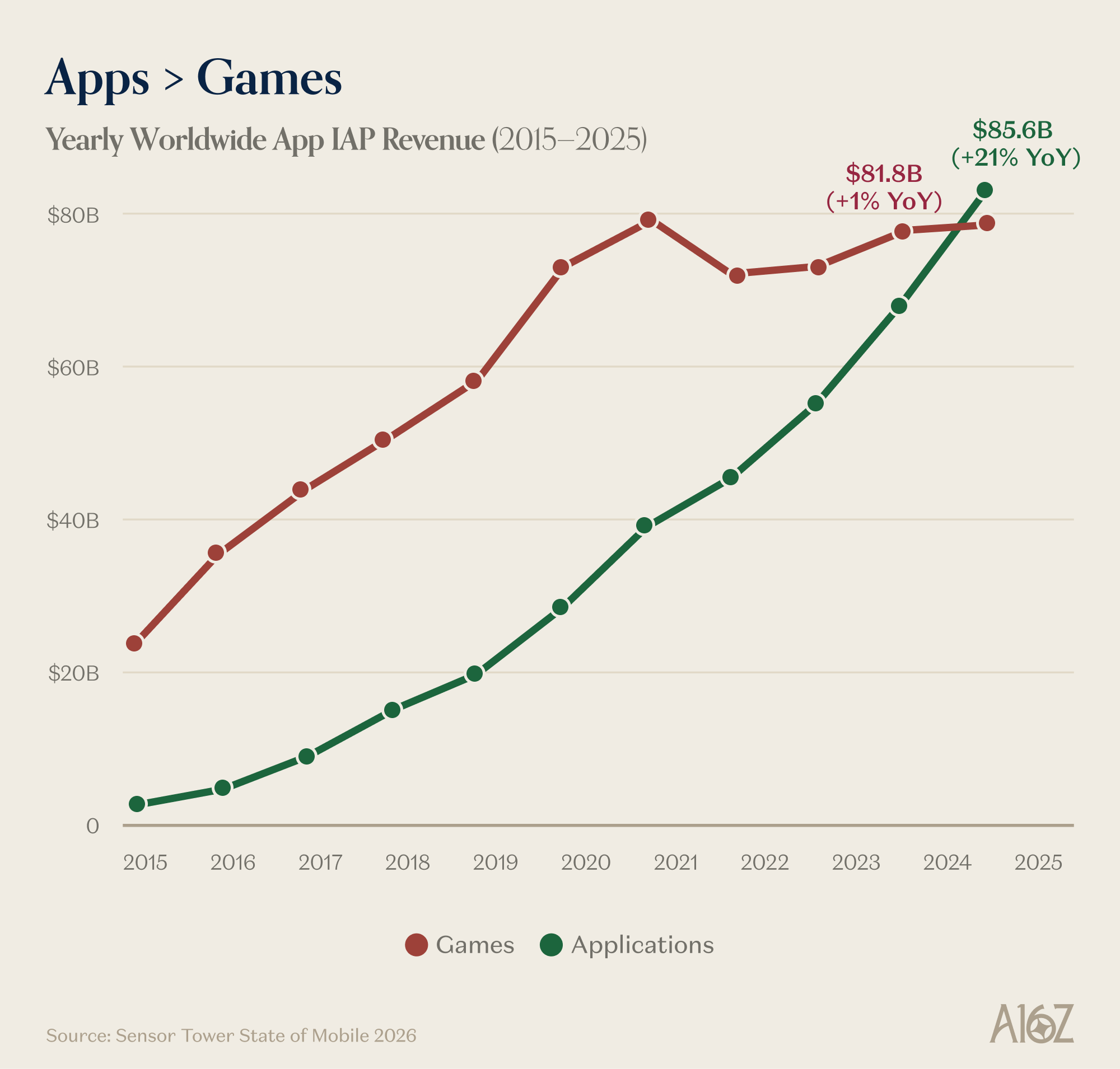 In-app revenues for apps hit $85.6B (growing 21% YoY) for 2025, passing the $81.8B for in-app game revenue.