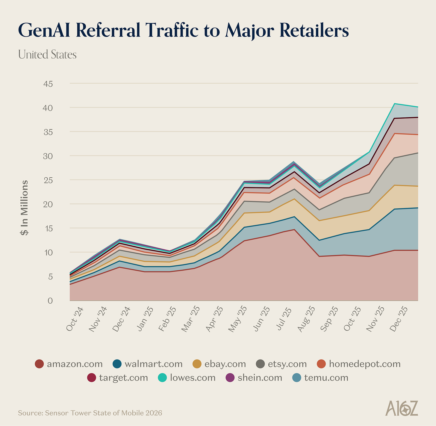 Walmart, Etsy, Home Depot, and Target have been the biggest beneficiaries of AI-driven traffic, with referrals growing ~1600%.
