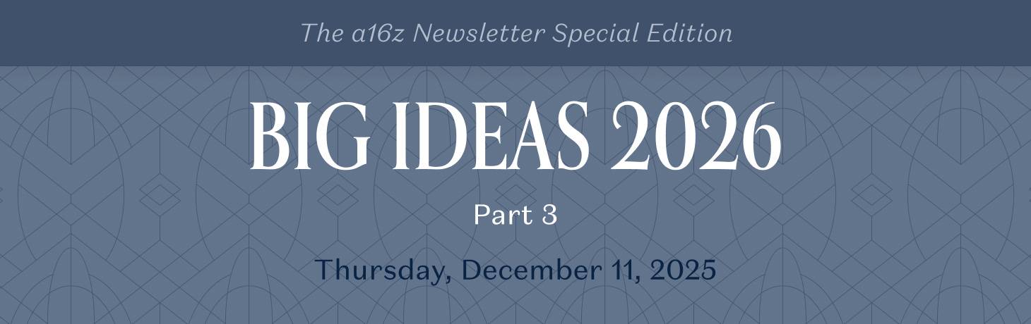 You’re receiving this newsletter because you signed up for it on our websites, at an event, or elsewhere (you can opt out any time using the ‘unsubscribe’ link below). This newsletter is provided for informational purposes only, and should NOT be relied upon as legal, business, investment, or tax advice. This newsletter may link to other websites or other information obtained from third-party sources — a16z has not independently verified nor makes any representations about the current or enduring accuracy of such information. Furthermore, the content is not directed at nor intended for use by any investors or prospective investors in any a16z funds. Please see a16z.com/disclosures for additional important details, including link to list of investments.