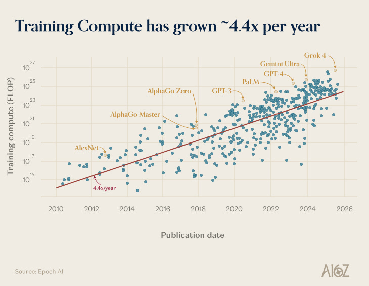 Let me explain. The bitter lesson is an oft-cited essay from Richard Sutton which posits that the AI methods that end up winning are those which most directly use compute. When faced with a trade off between clever algorithms, clever engineering, and brute force compute, it’s best to choose the latter. This allows the approach to benefit from the dramatic increase in availability of compute, not just due to Moore’s law, but because AI training and inference can be parallelized, it can benefit from the increasing amount of GPUs we can cram into a large datacenter.