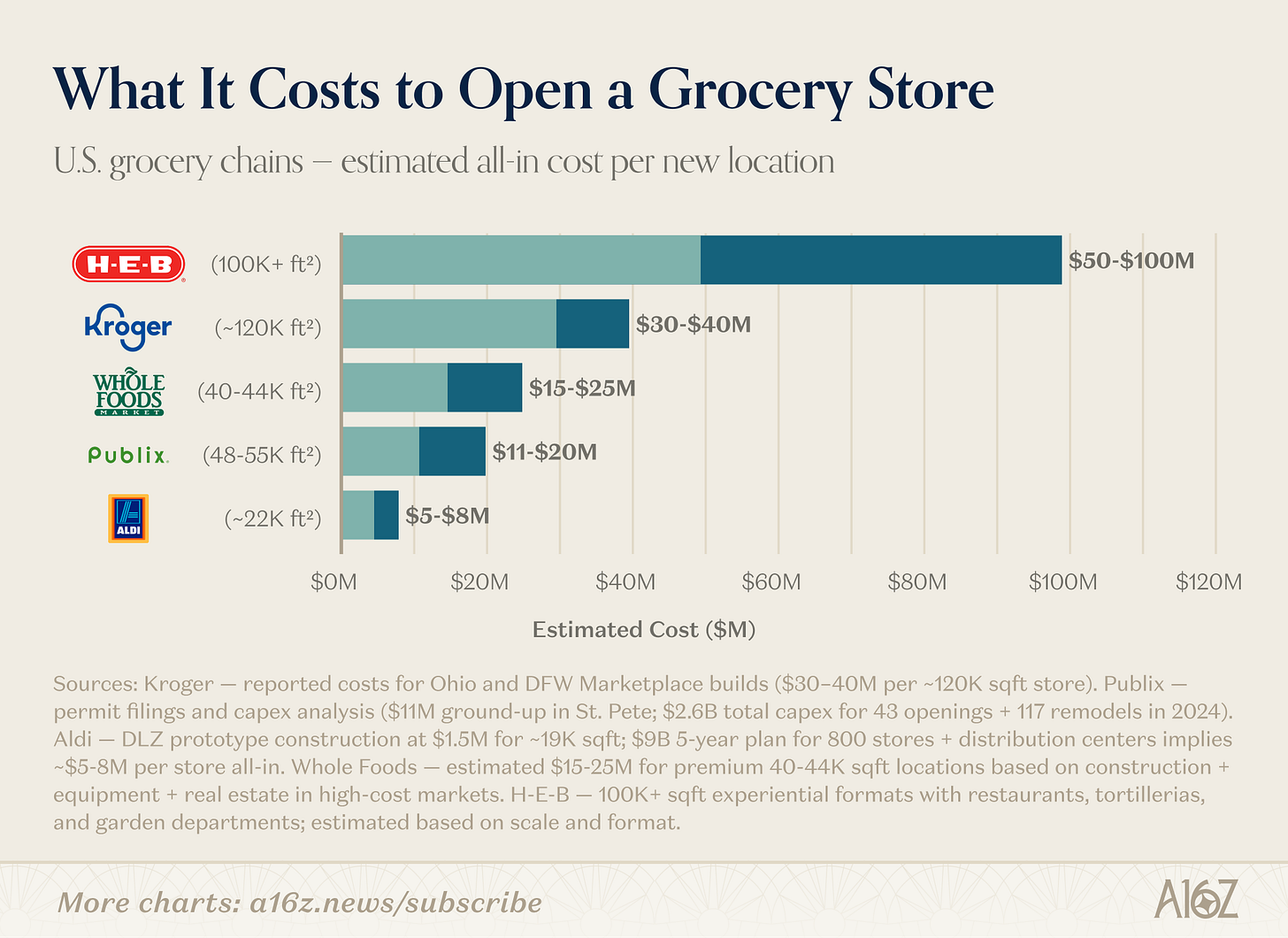 Fortunately, grocery is a well-solved problem, with plenty of data on what it typically costs to open a new grocery store. In case you were wondering, $30M is indeed a bit rich. Consider the following napkin-math of how much grocery $30M might otherwise buy:1