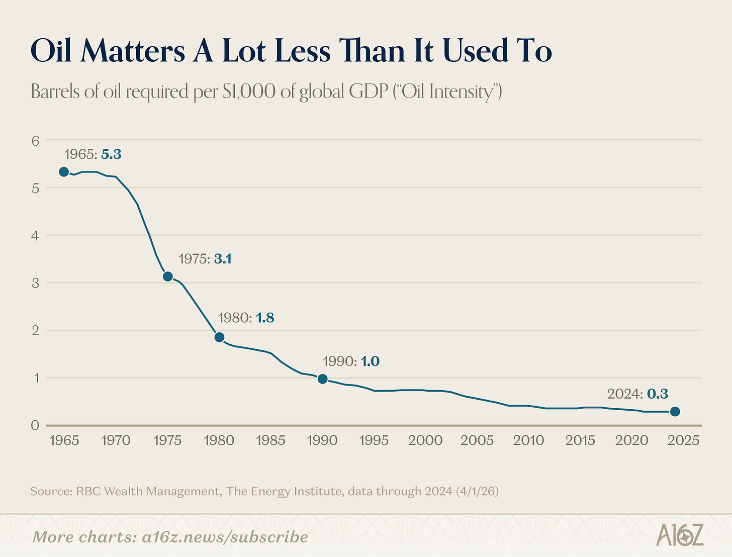 The number of Barrels of oil needed to produce $1,000 of global GDP (“Oil Intensity”) have fallen from 5.3 in 1965 to 0.3 in 2024.