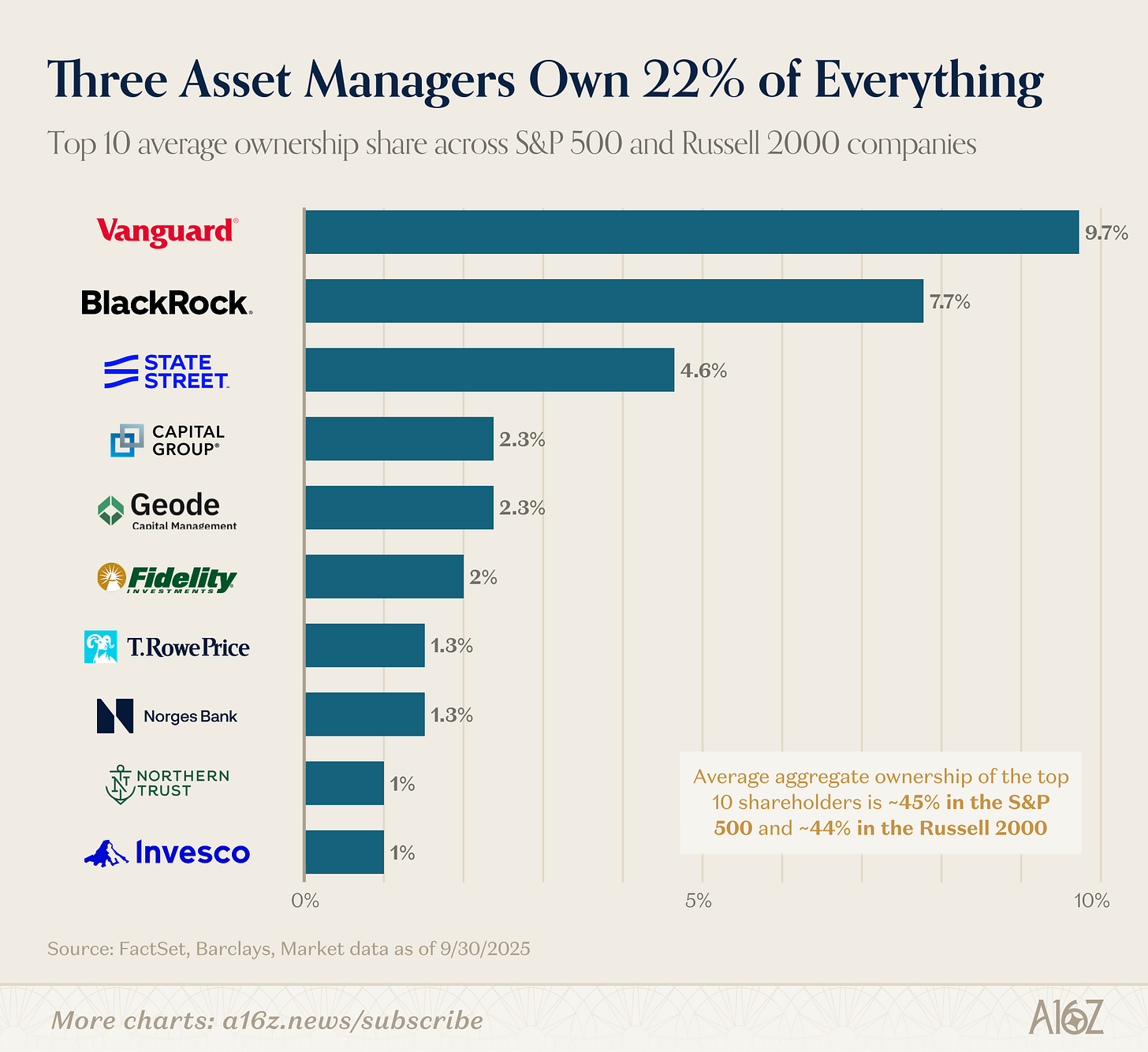 BlackRock, Vanguard, and State Street (the “Big Three”) together own ~22% of the average S&P 500 company, and the top 10 shareholders own ~45%. These firms have large stewardship teams and their own in-house voting policies.
