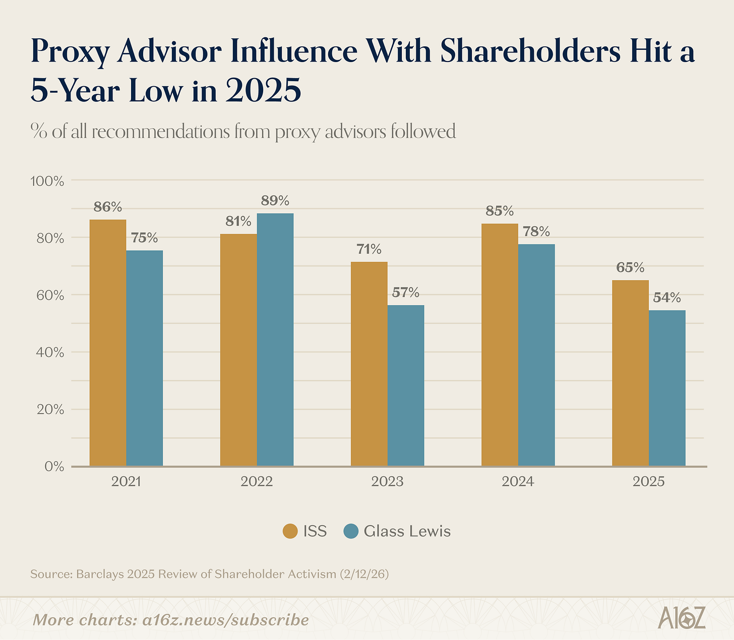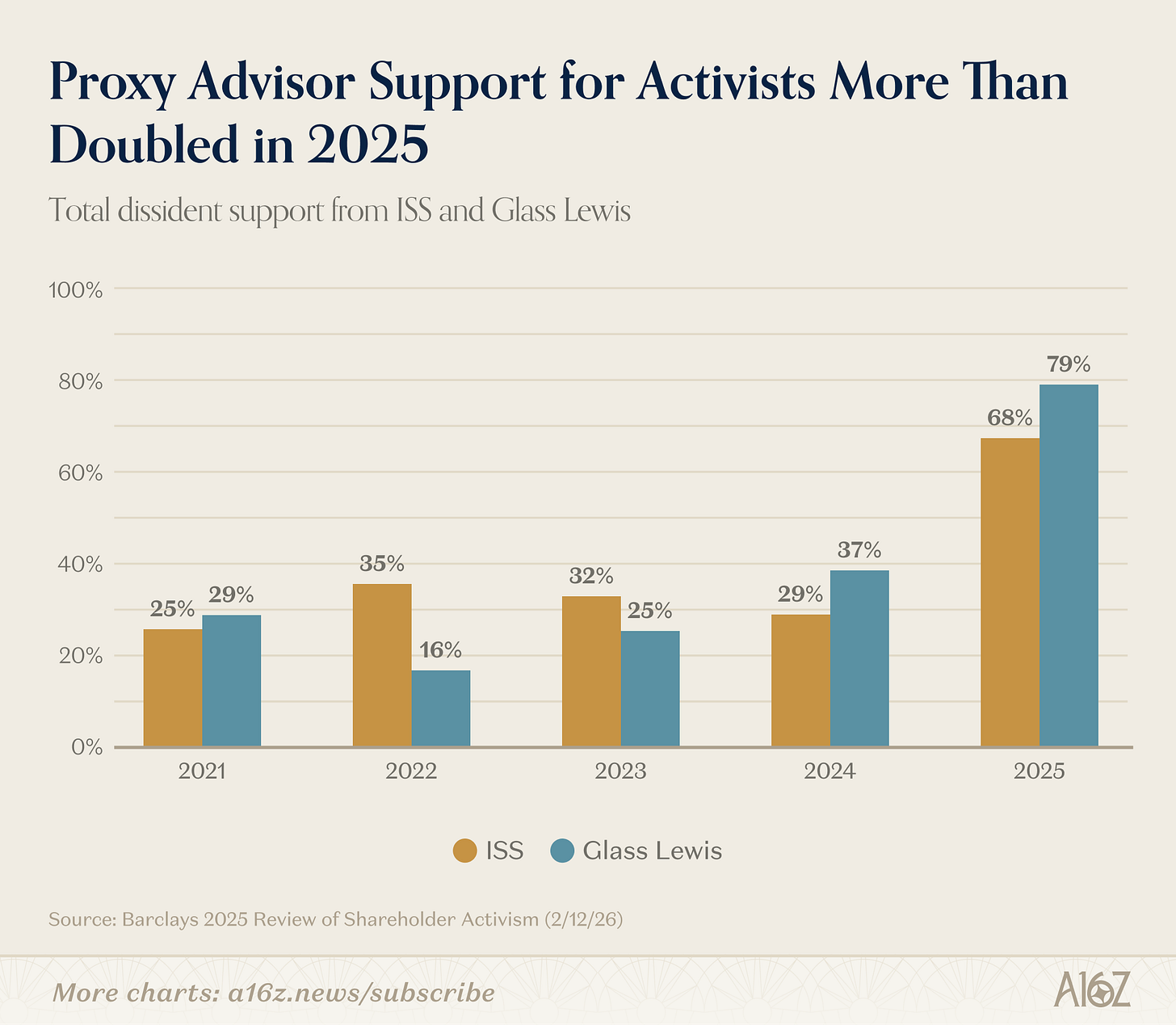As Barclays put it in a 2025 review of shareholder activism, “ISS and Glass Lewis were significantly more likely to back dissident nominees in 2025 but their support was relatively less meaningful in determining outcomes.”