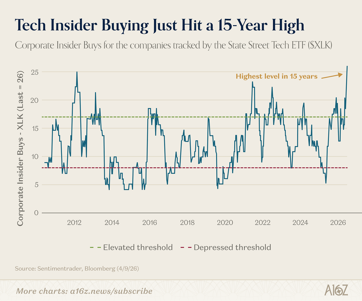 According to one analysis, corporate insider buying for the companies tracked by the State Street Tech ETF ($XLK) reached its highest level in 15 years.
