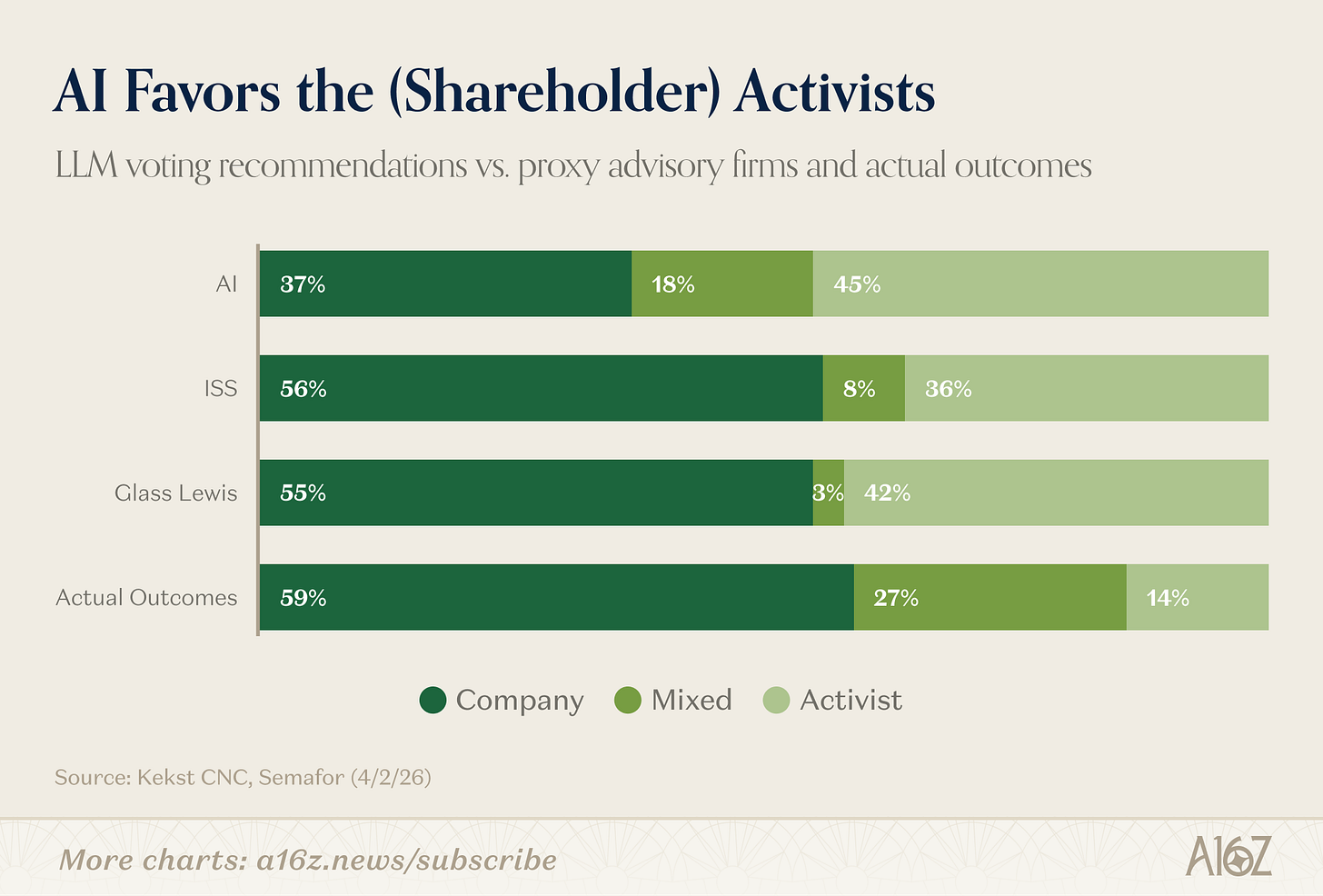 They asked four frontier AI models to weigh-in on ~50 recent proxy fights, and compared the AI recommendations to the advice of the two leading proxy advisories (ISS and Glass Lewis), and actual outcomes: