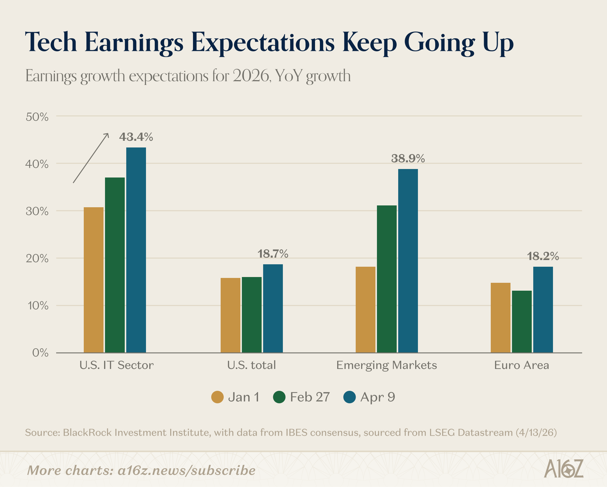 BlackRock’s data shows growth expectation for the US IT sector rising from 31% at the start of the year all the way to 43.4% as of April 9. The broader US market, by comparison, is sitting at mere 18.7%.