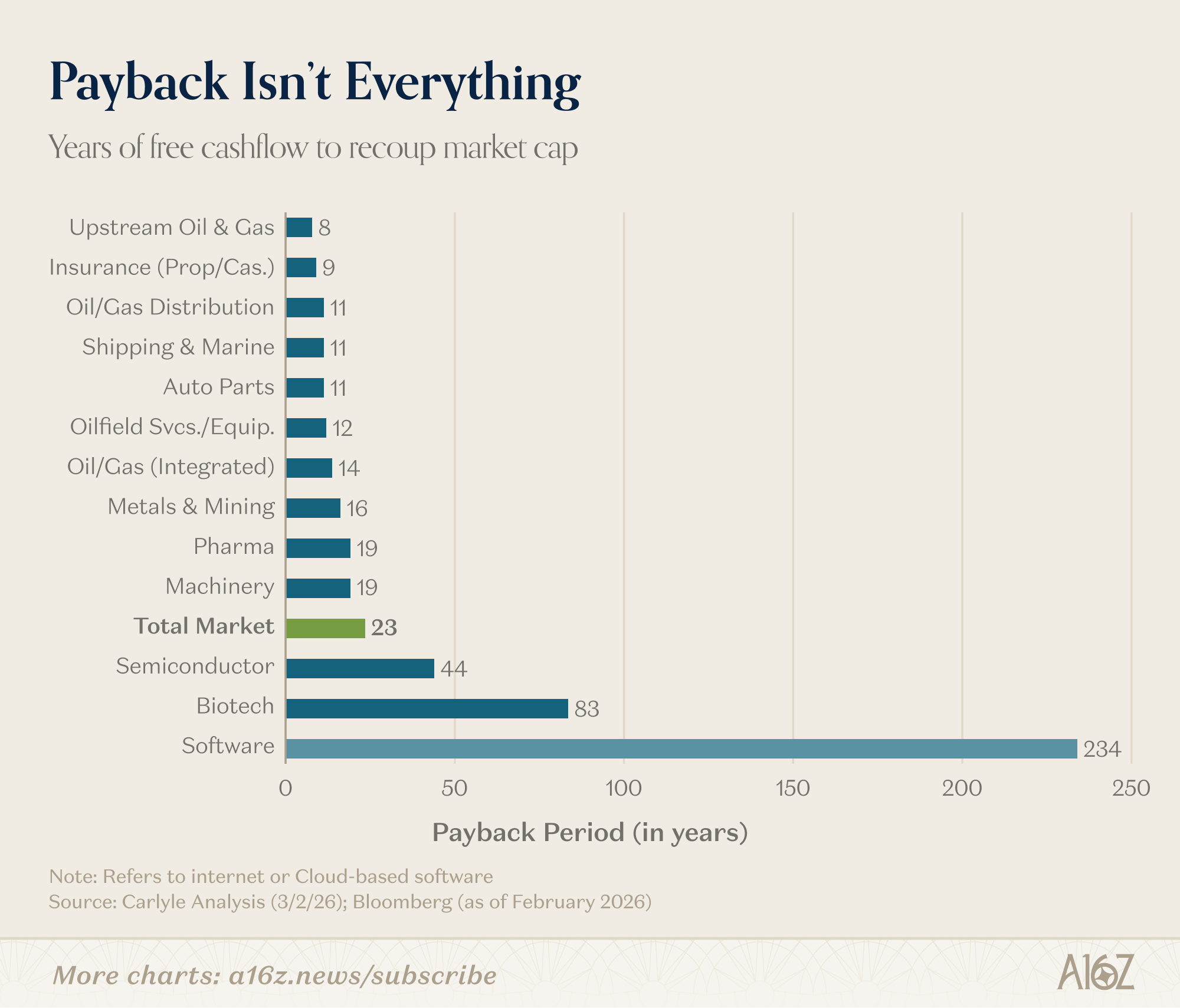 Taking this at face-value (and yes, there are reasons why this comparison isn’t fair), it would take more than 10x longer for software businesses to “payback” their current market caps with their current free cash flow, relative to the more industrial parts of the economy. That sort of thing will happen when a massive chunk of tech’s free cash flow gets plowed straight into the industrial parts of the economy.