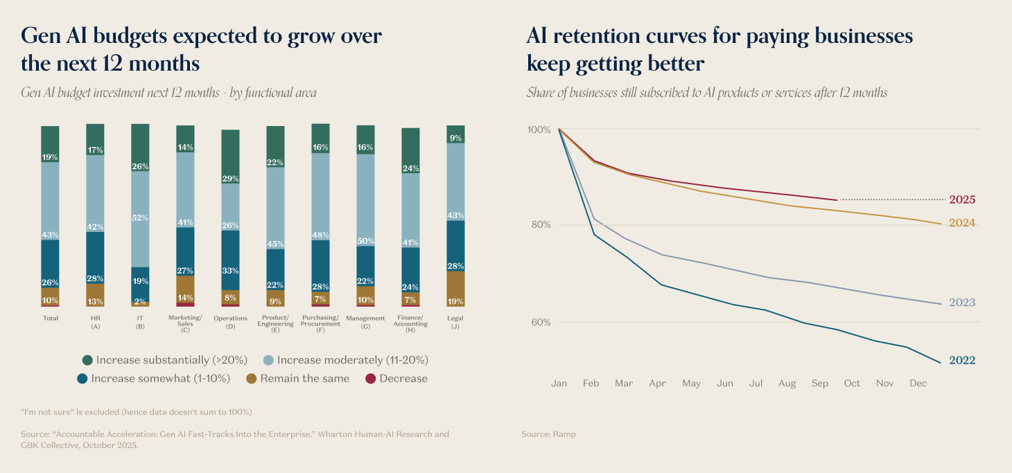 Also of note: the number of respondents expecting to decrease spend is barely visible. That’s consistent with the wildly impressive retention curves, recently highlighted by Ramp’s spending data: AI retention curves for business customers have improved every year, with current 9-month retention just under 90%.