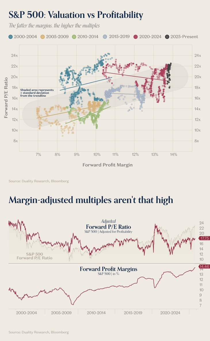 Not so fast. It’s true that multiples on earnings are historically high, but it’s also true that companies are historically profitable–and valuations have scaled accordingly. The higher the margins, the higher the p/e ratio.