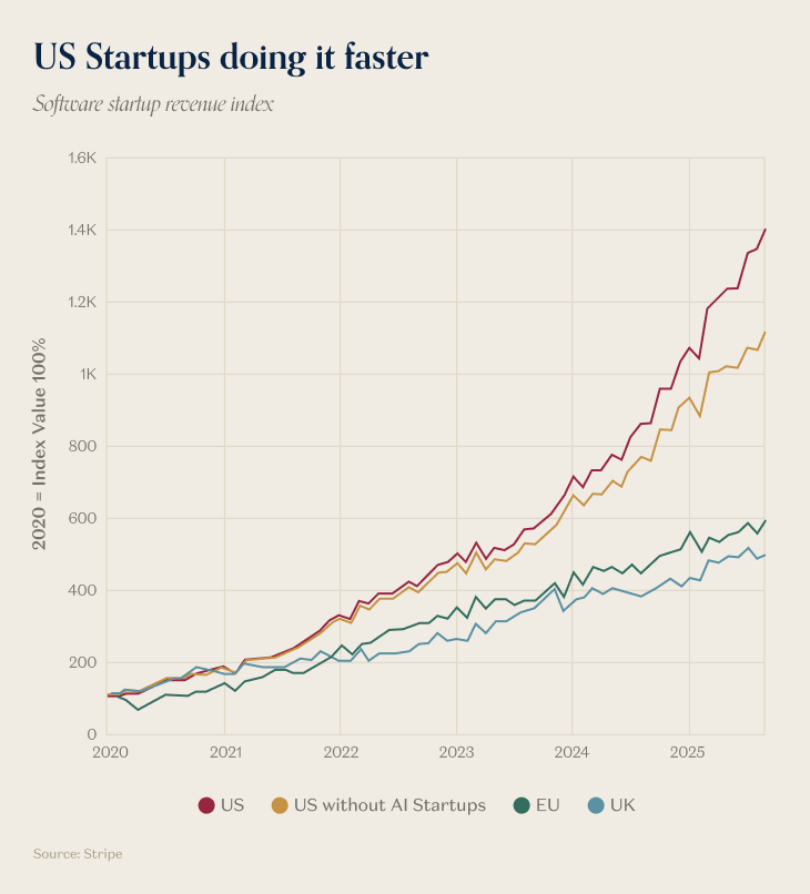 It’s not AI-either. When you strip out AI, US startups still have a pretty wide lead. Although, interestingly enough, AI startups did start to pull away from non-AI, sometime around 2024.
