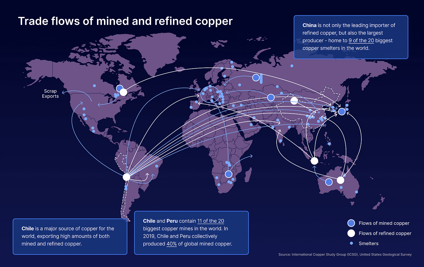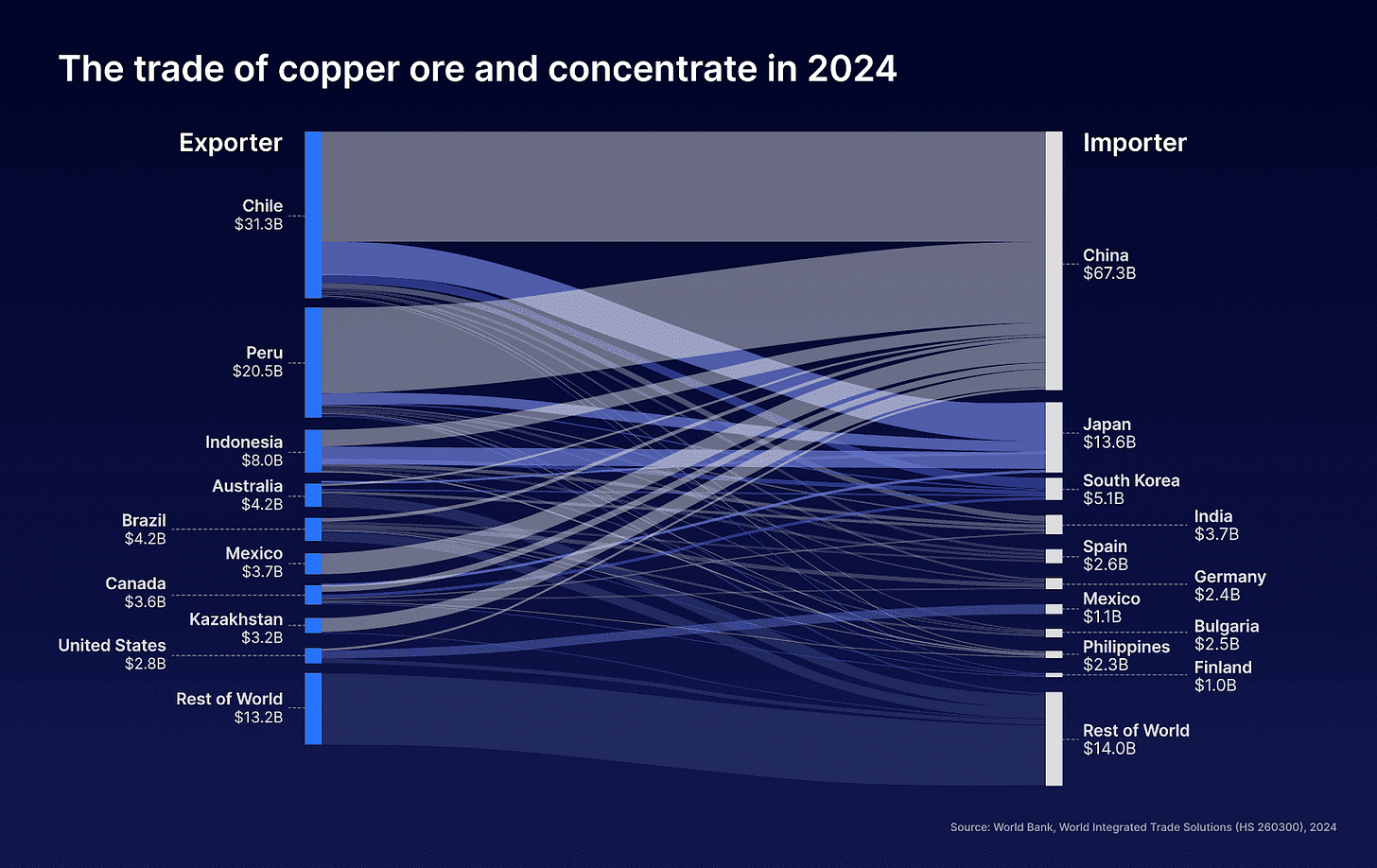 Copper production and trade are highly concentrated. A small group of mining countries - Chile, Peru, Indonesia, Australia and Brazil - account for the majority of global copper ore exports, reflecting the concentration of major deposits in the Andes and Asia-Pacific regions. On the demand side, China dominates as the world’s largest importer, with Japan and South Korea also serving as major buyers.