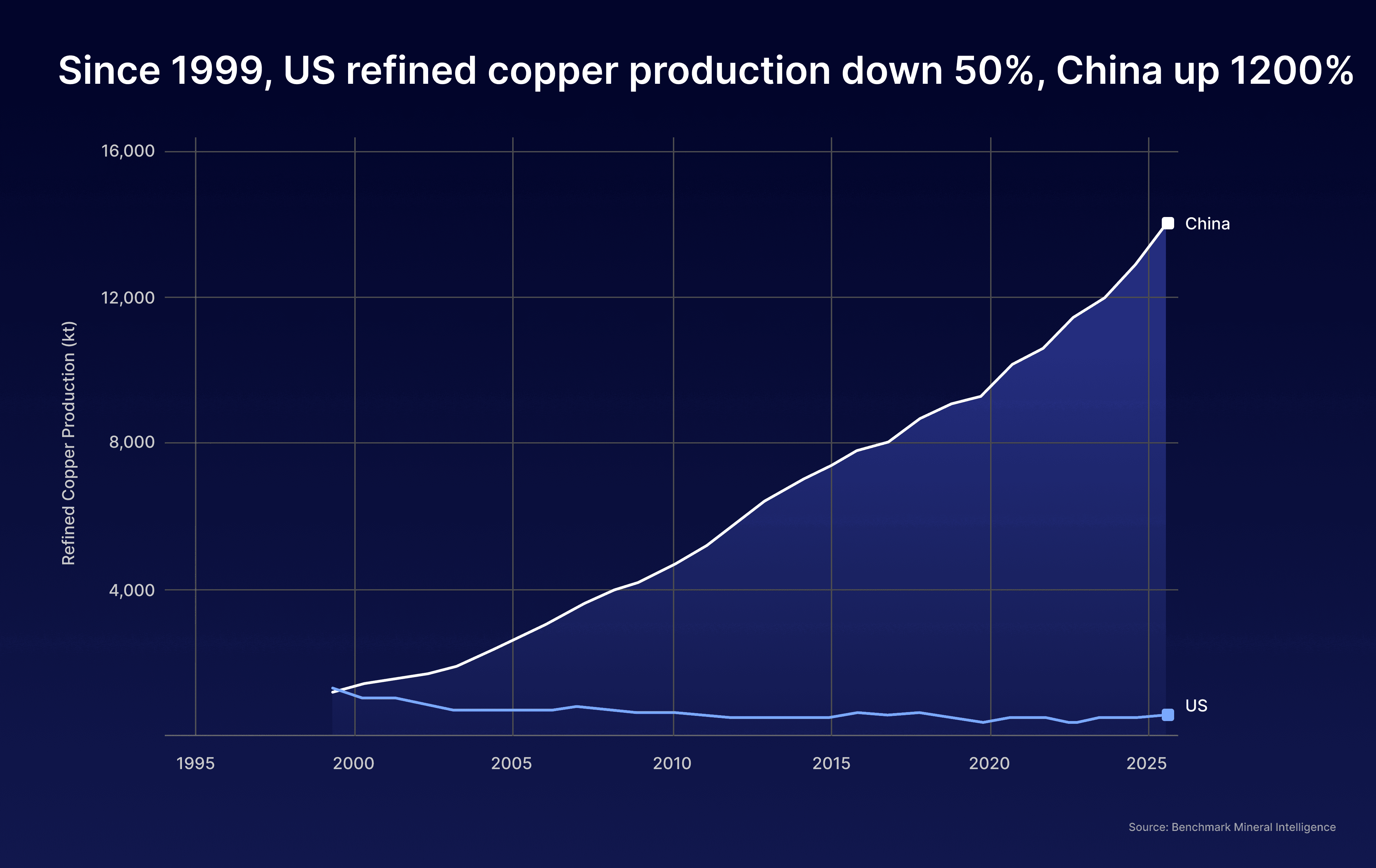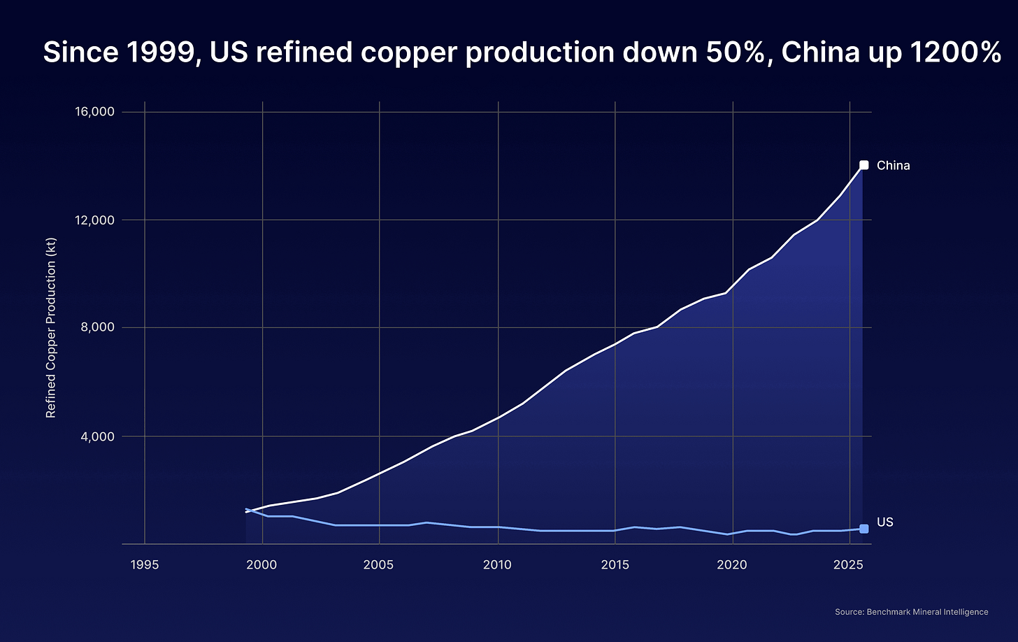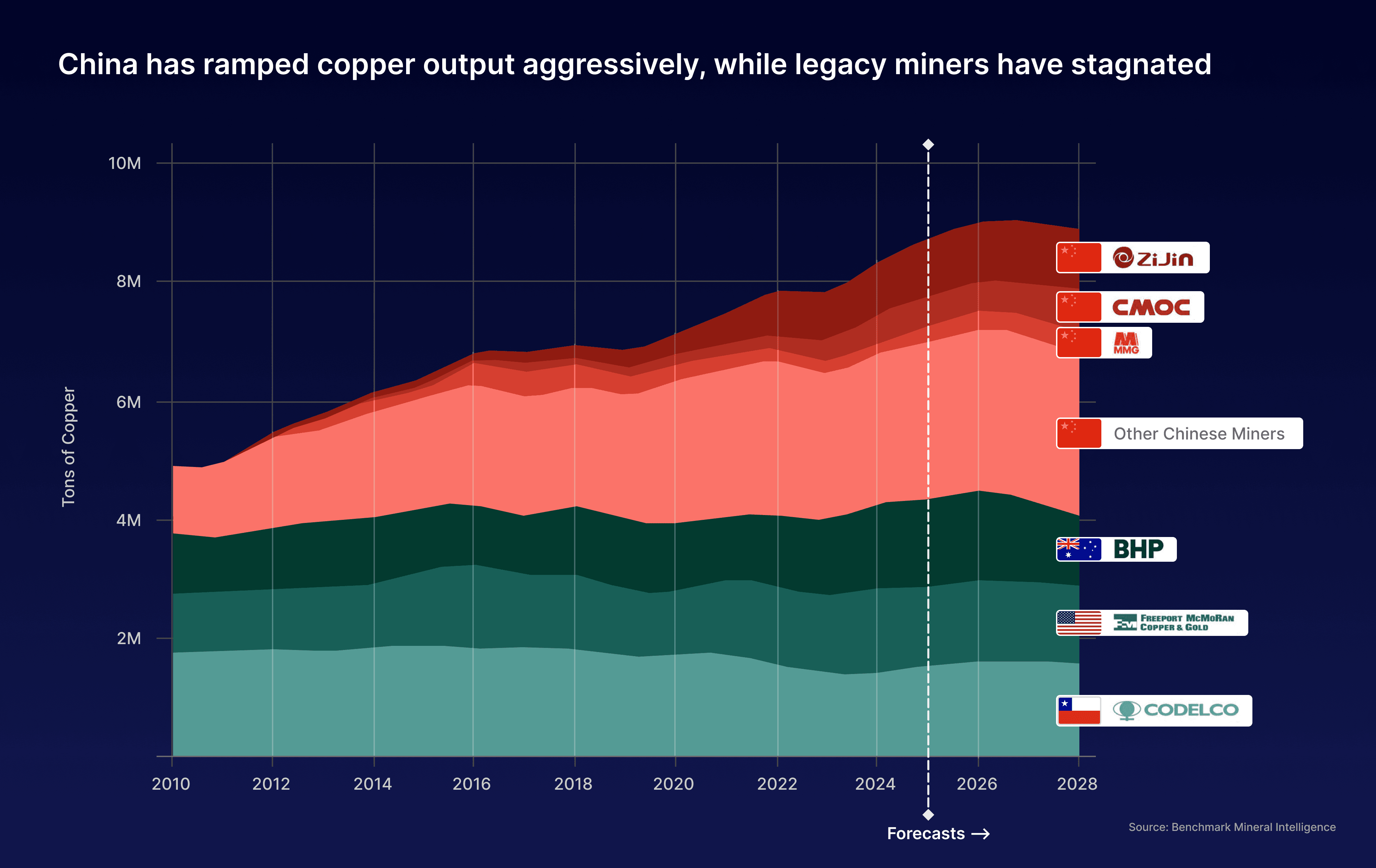 The issue isn’t isolated to the U.S. Over the past 25 years, major Western copper producers globally have struggled just to maintain output, while Chinese companies have scaled globally to levels that today exceed the combined production capacity of their Western counterparts.