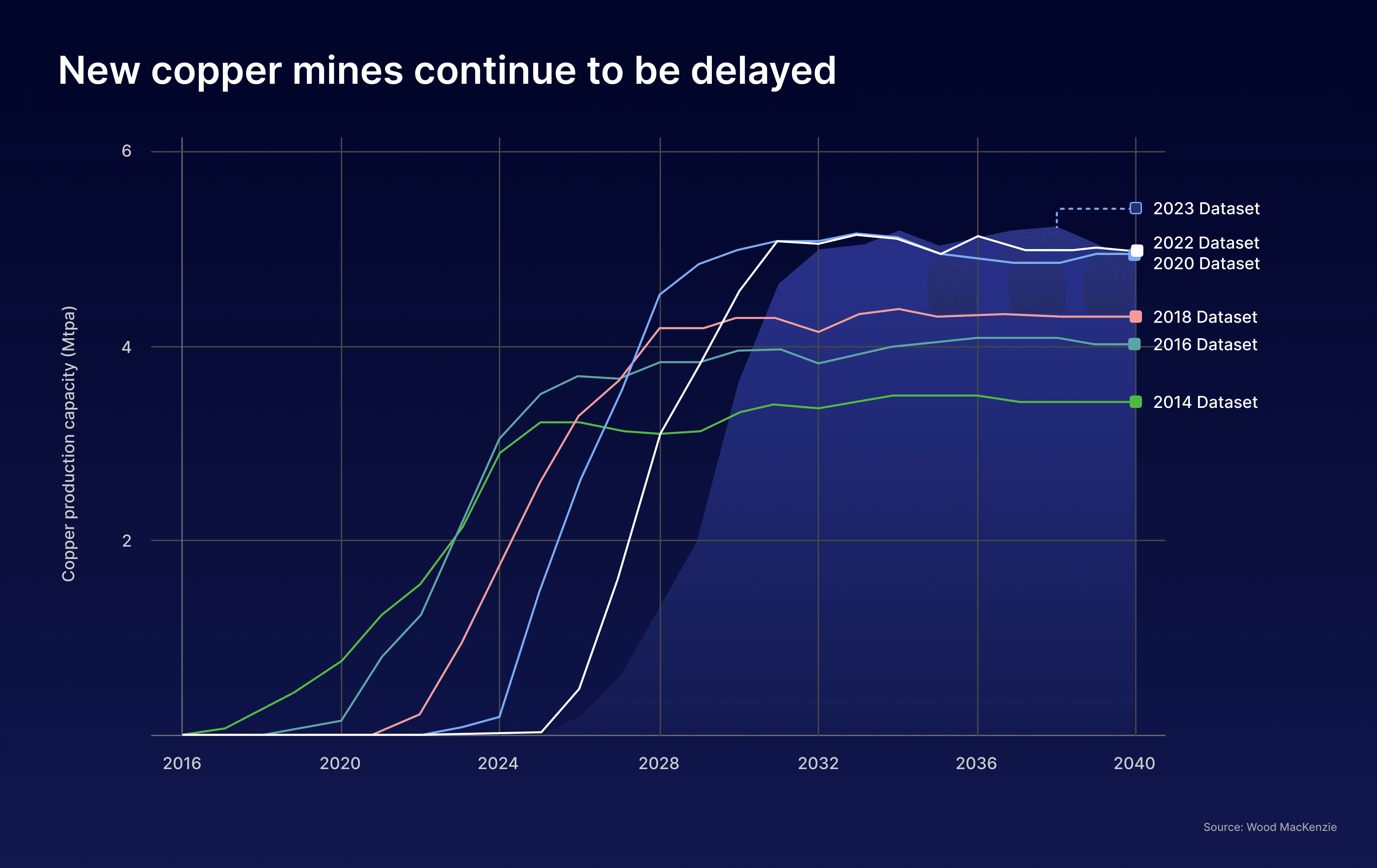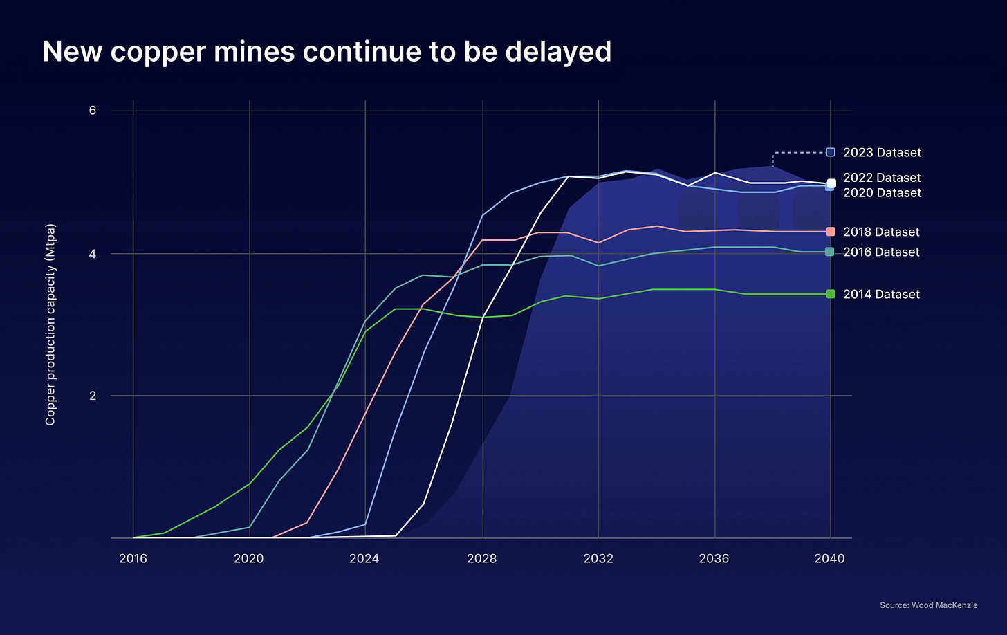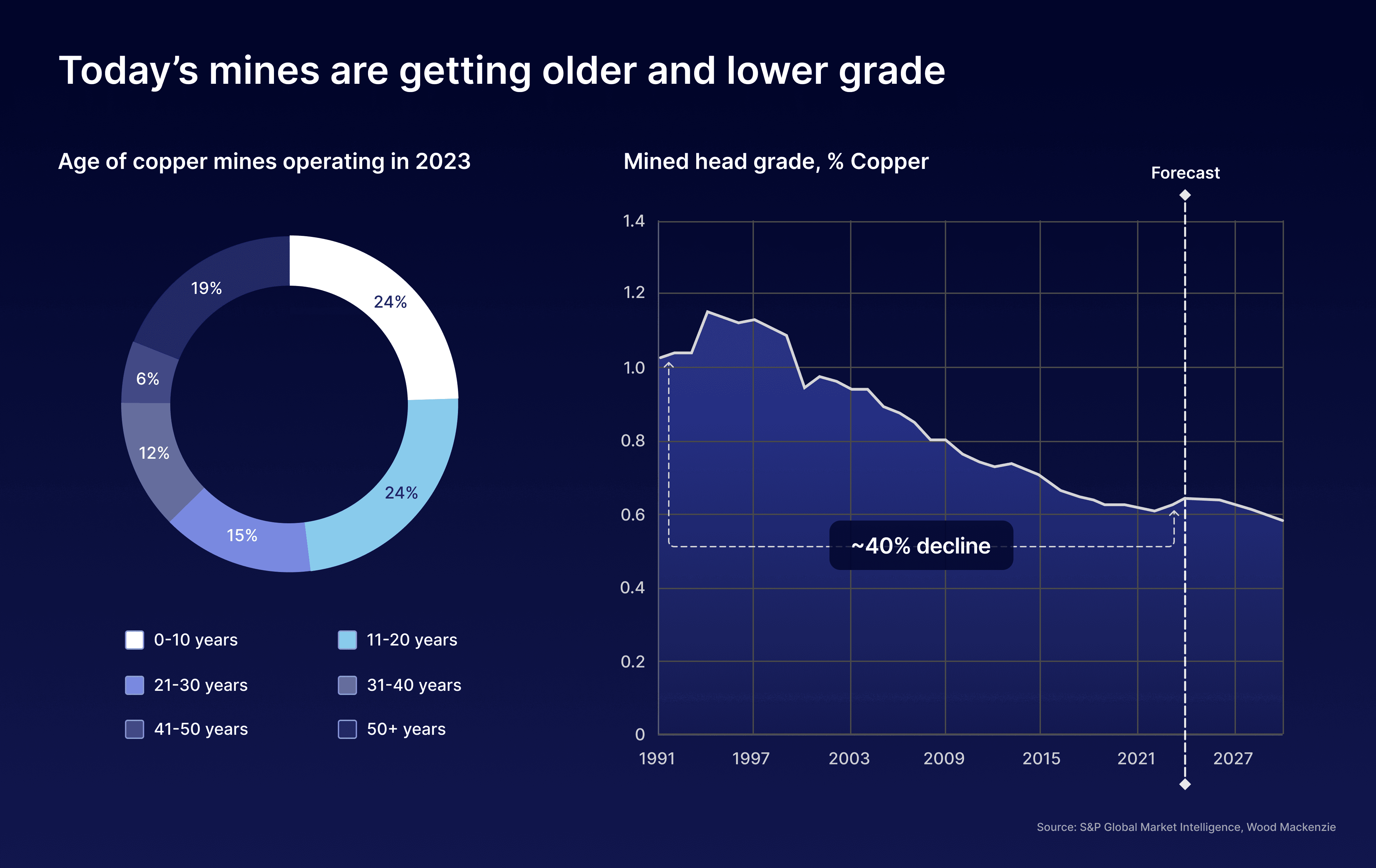Miners extract their most economic resources first, targeting the highest-grade ore for extraction. As copper mines age, the grade of the remaining resource reduces. More than half of operating copper mines globally are over 20 years old, forcing operators to mine more material to produce the same amount of copper each year. This presents a structural issue that must be addressed with new mines and new mining and refining technologies to reduce costs.