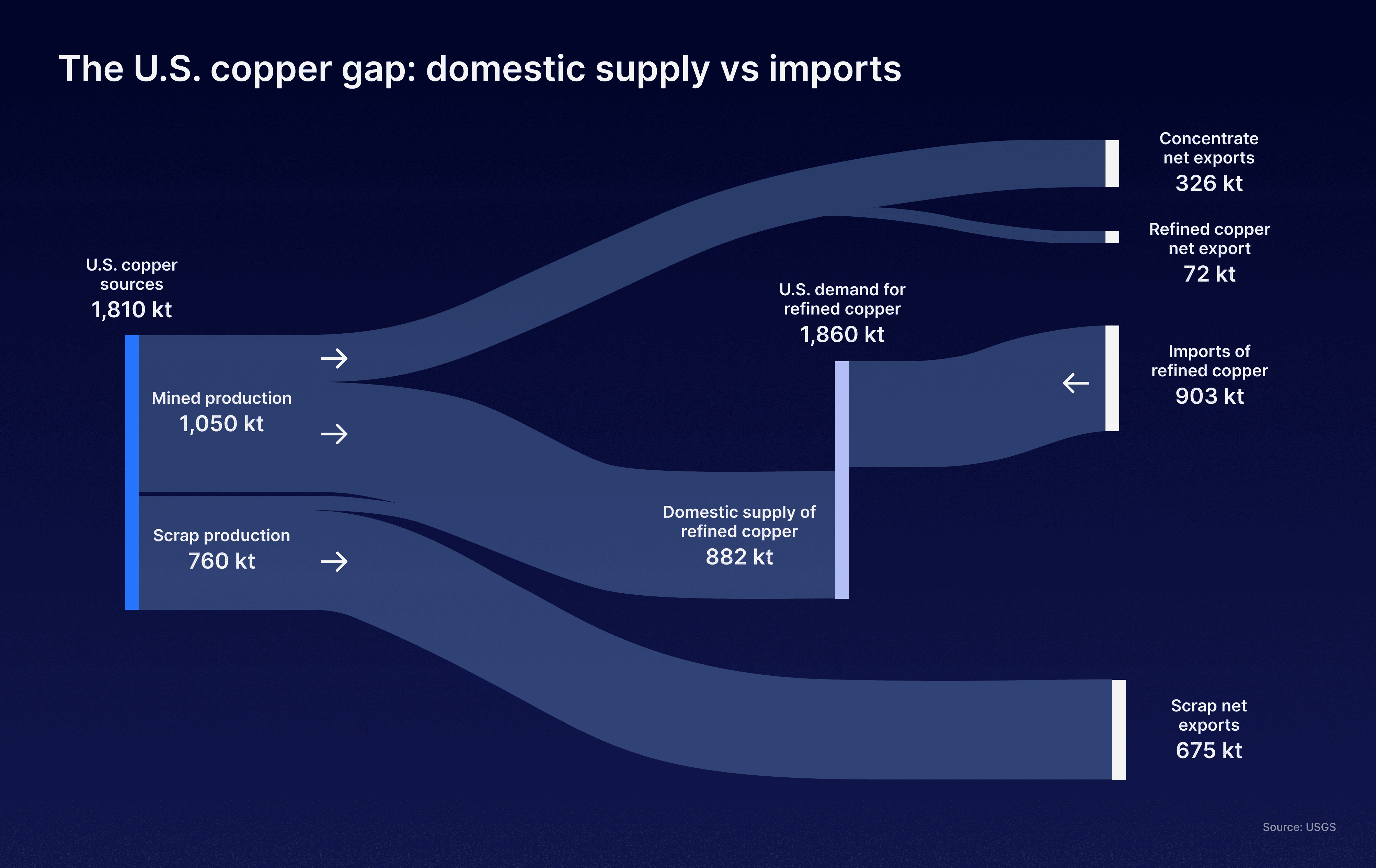 Satisfying domestic copper demand requires both mining and processing capacity. Even when copper is mined domestically or available for recovery through scrap, huge volumes are exported for smelting or refining abroad and then re-imported as refined copper. This processing bottleneck, combined with rising demand from electrification, renewable energy systems, and data centers, has created a structural deficit that cannot be solved by mining alone. The U.S. needs expanded domestic recycling, refining, and smelting capacity to close the gap.