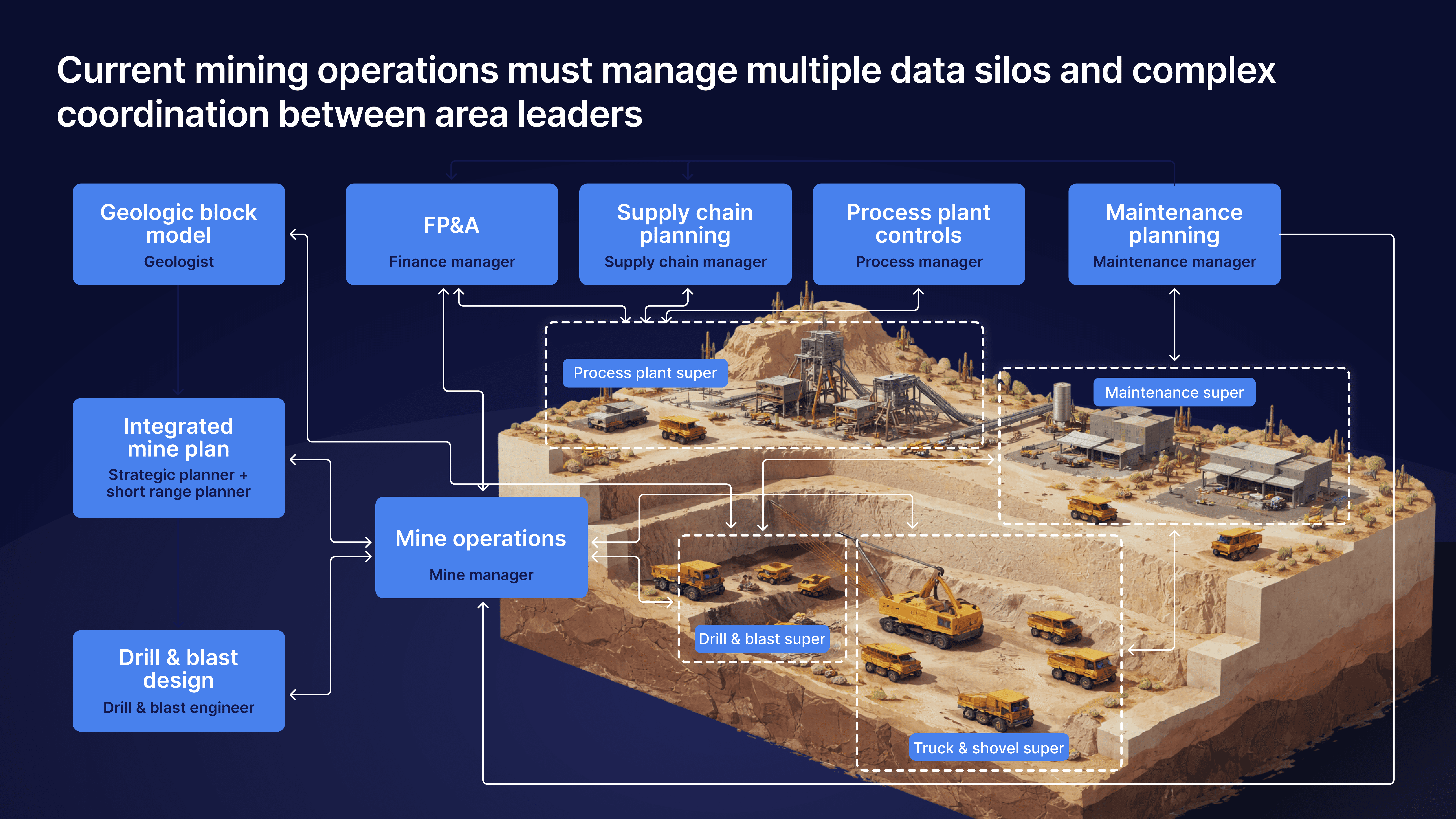 Mining and refining operations require thousands of cross-functional decisions daily. Today those decisions are informed by fragmented data management systems and driven by human intuition. This leads to significant shift-to-shift performance variability and exposes the major challenge we face today: we don’t have enough people that know how to operate and optimize these complex systems.