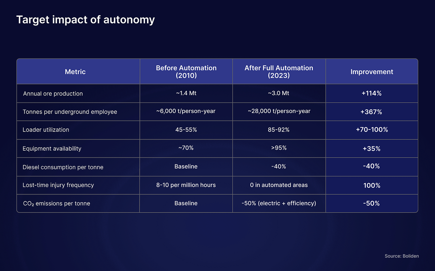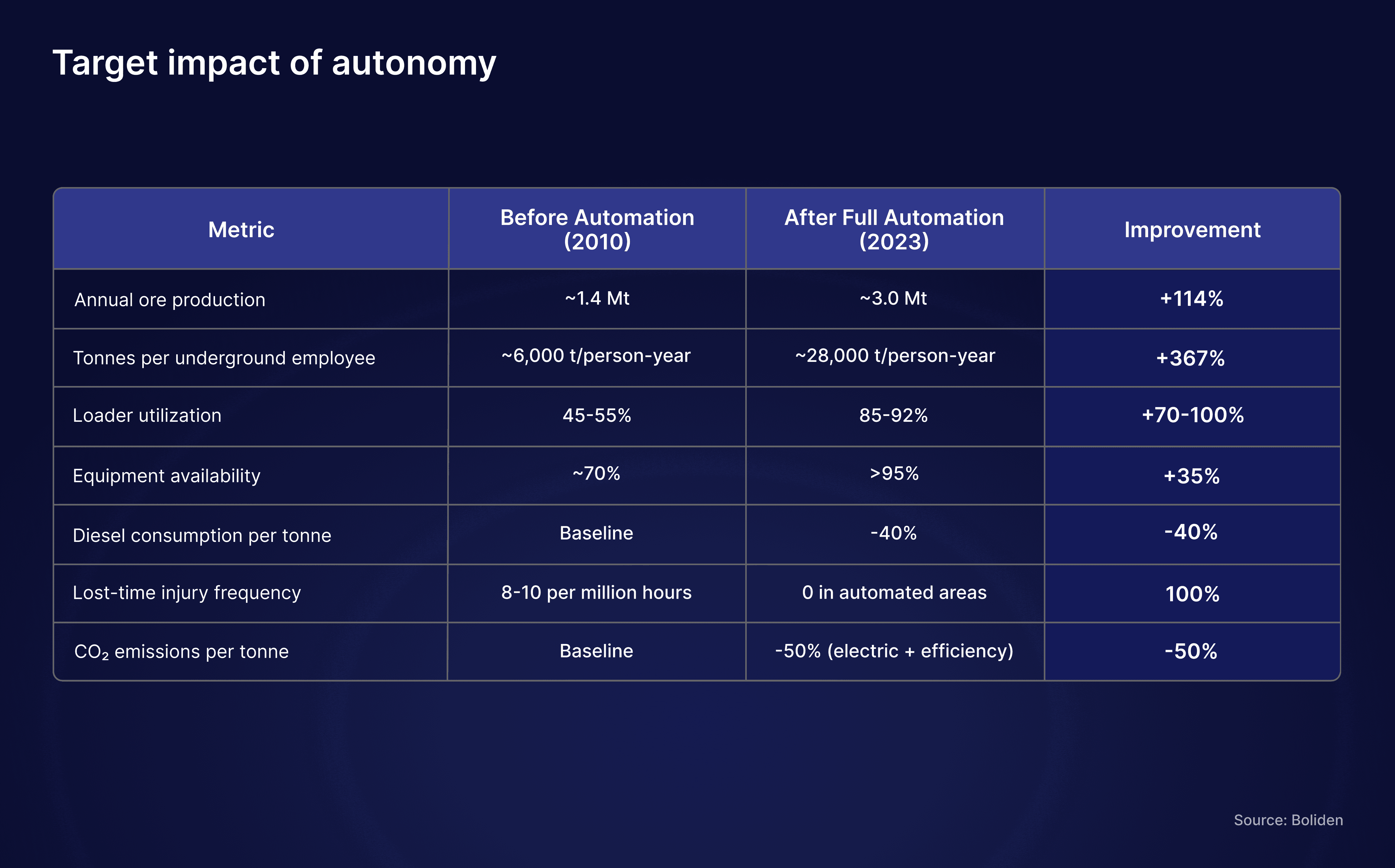 MarianaOS will significantly improve mining productivity, efficiency, safety, and environmental performance at Copper One. This is increasingly critical as over 200,000 people in the current US mining workforce will retire this decade, while fewer than 400 mining engineering students graduate annually in the US. The data below shows actual results from the Garpenberg Mine in Sweden, which implemented automation and remote control over a 13-year period. The operator realized step-change improvements in productivity, equipment utilization, diesel consumption, and workforce injuries.
