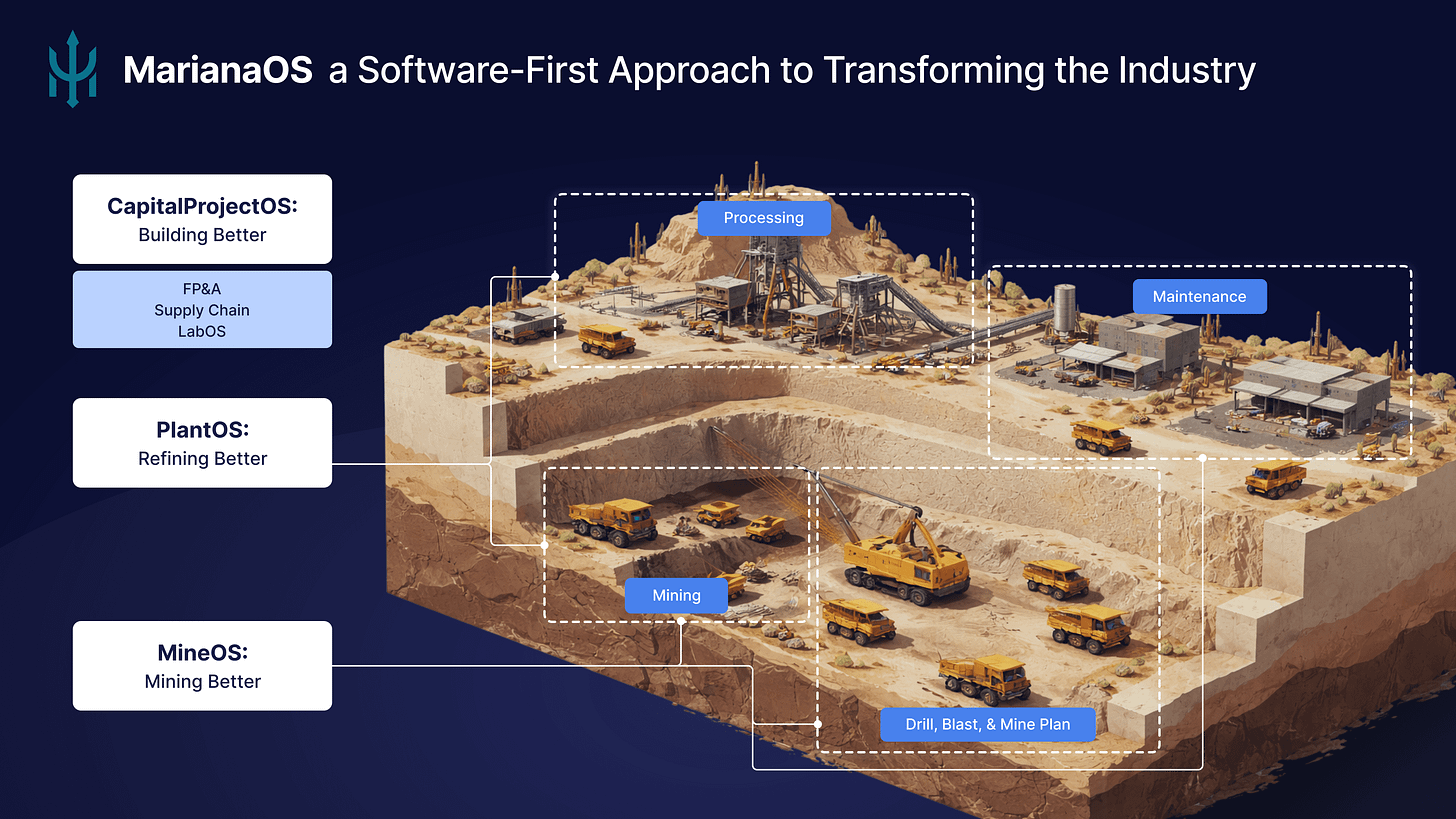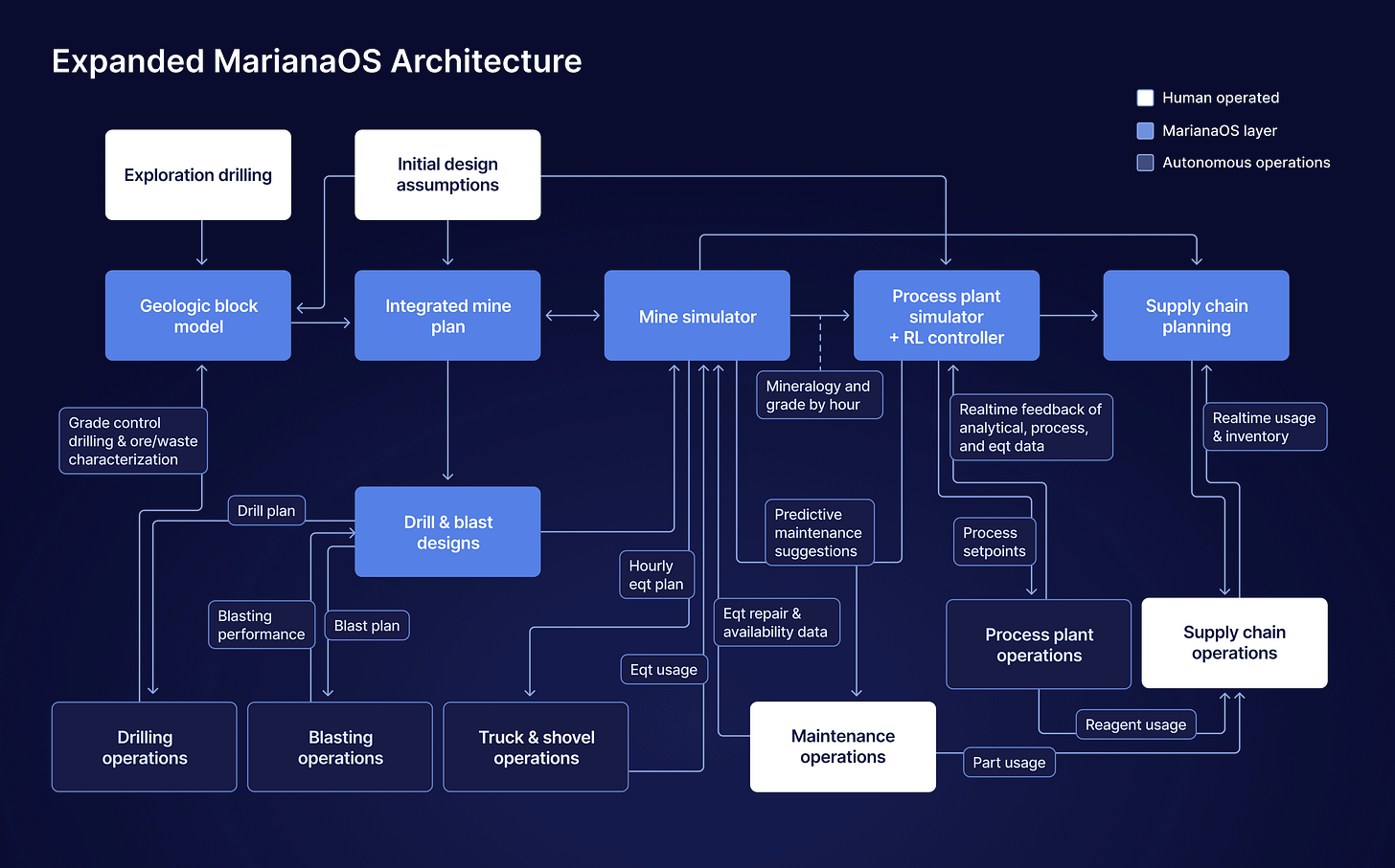 MarianaOS uses simulation, predictive maintenance, and reinforcement learning to automate drill and blast operations, truck and shovel orchestration, and process plant control based on real-time data; it handles continuous optimization and data integration while engineers, geologists, operators, and planners validate models, monitor the operation, and execute essential, hard to automate tasks. The expertise and creativity of great people remain essential, but autonomy and agentic workflows enable us to mine and refine more while the skilled labor pool shrinks.