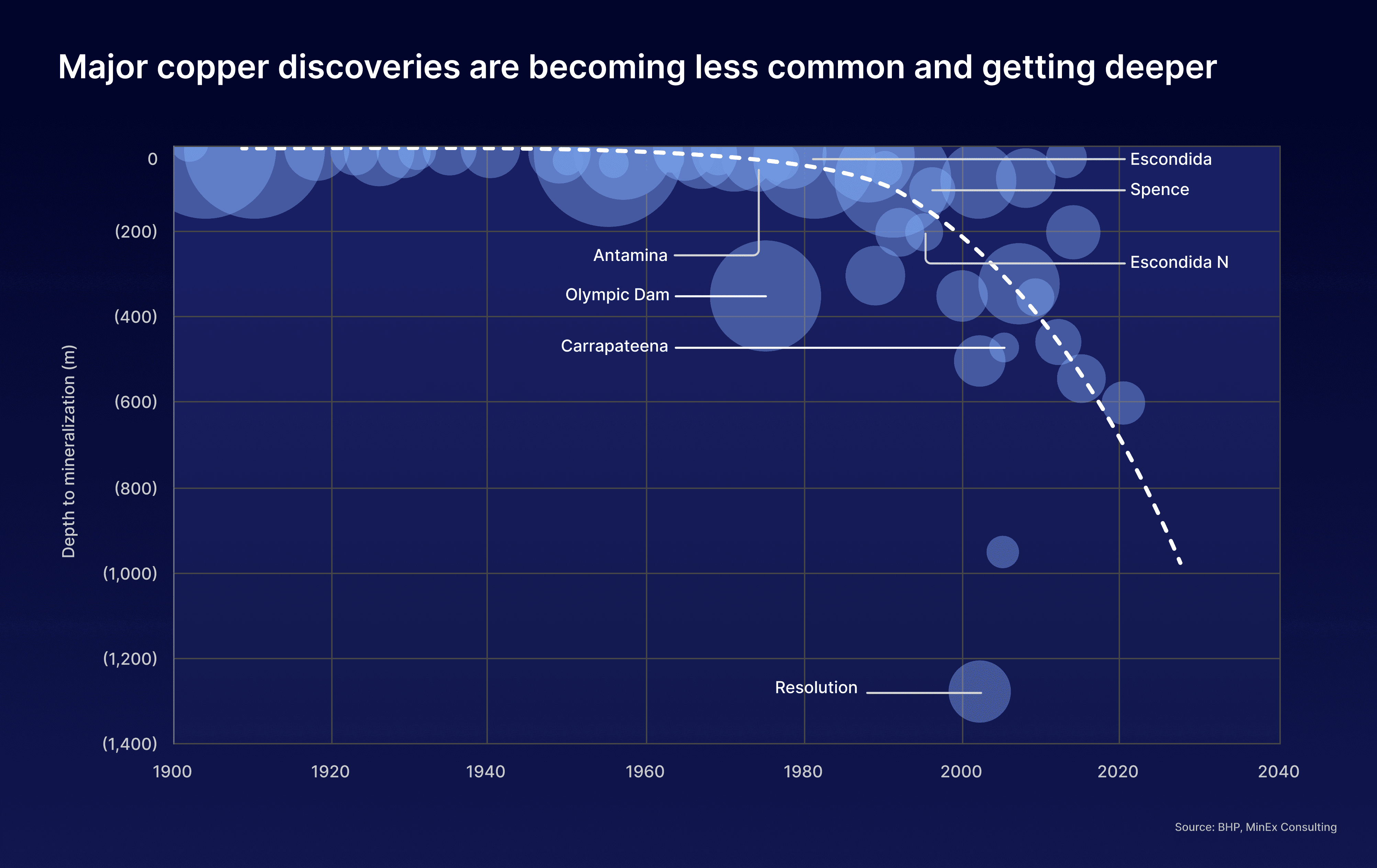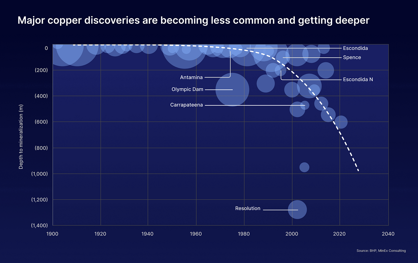 The number of large copper discoveries has declined sharply since the 1990s, and the deposits we do find are deeper and harder to develop. The industry’s reserve growth mostly comes from expanding existing deposits rather than finding new ones.