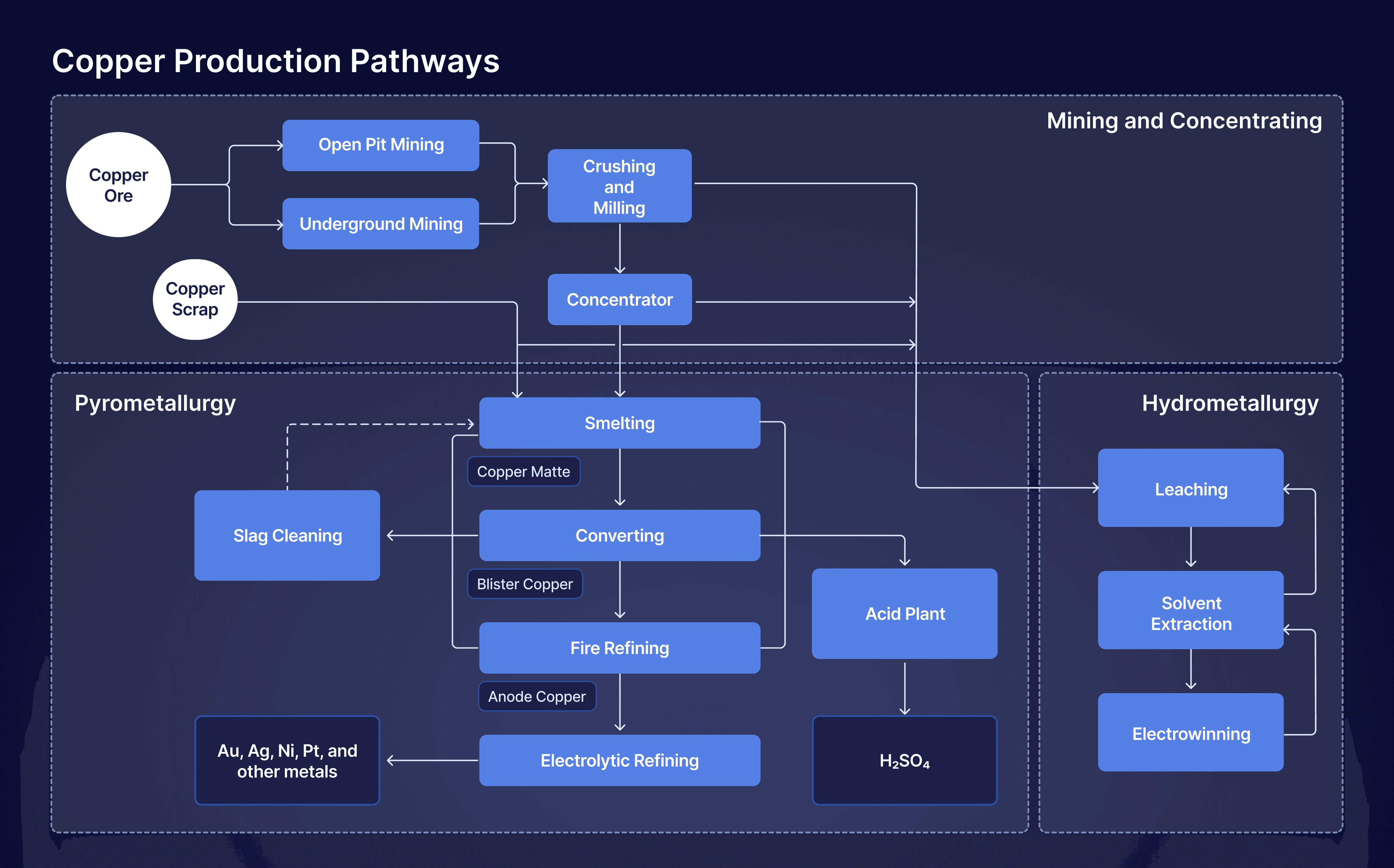 Primary copper supply (mined copper) typically comes from 2 types of ores: copper sulfides and copper oxides. These ores are mined via open pit or underground mining, then processed through 2 common pathways - pyrometallurgy (high-temperature smelting) and hydrometallurgy (chemical leaching and solvent extraction) - to produce high-purity copper cathode for downstream manufacturing.