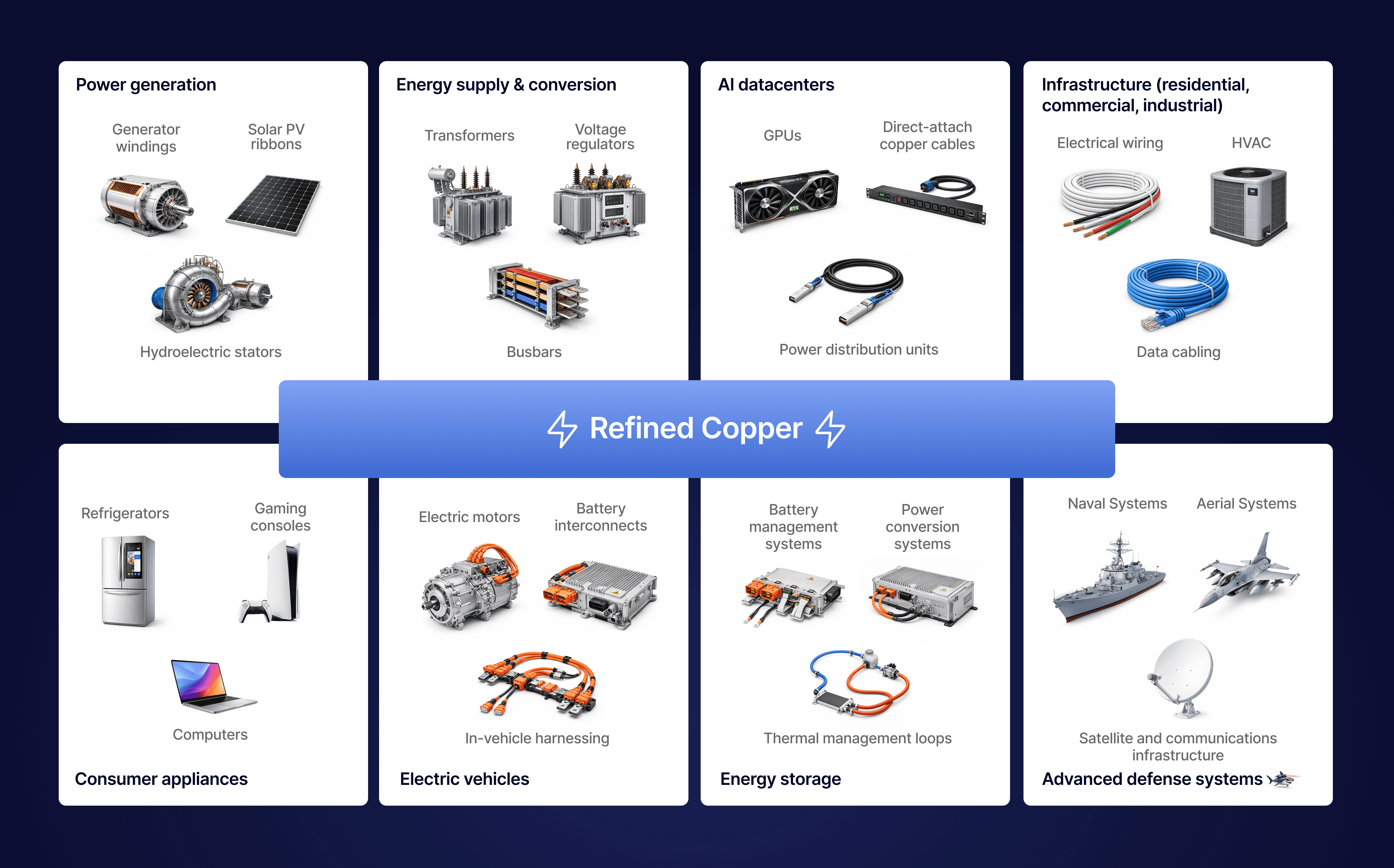 Copper is the circulatory system of the modern economy. Nicknamed “Dr. Copper” for its ability to diagnose economic health, copper is central to power generation, supply and conversion, AI datacenter build-out, residential, commercial and industrial infrastructure, electric vehicles, grid-scale energy storage, and advanced defense systems. Anywhere electricity is generated or consumed, copper is at work.