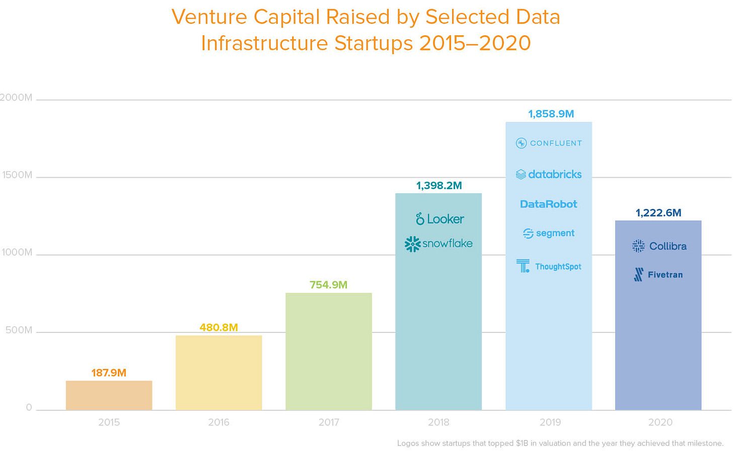 One of the primary motivations for this report is the furious growth data infrastructure has undergone over the last few years. According to Gartner, data infrastructure spending hit a record high of $66 billion in 2019, representing 24% – and growing – of all infrastructure software spend. The top 30 data infrastructure startups have raised over $8 billion of venture capital in the last 5 years at an aggregate value of $35 billion, per Pitchbook.