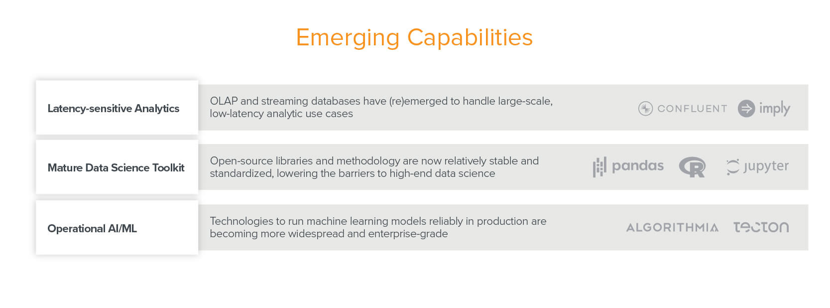 A set of new data capabilities are also emerging that necessitate a new set of tools and core systems. Many of these trends are creating new technology categories – and markets – from scratch.