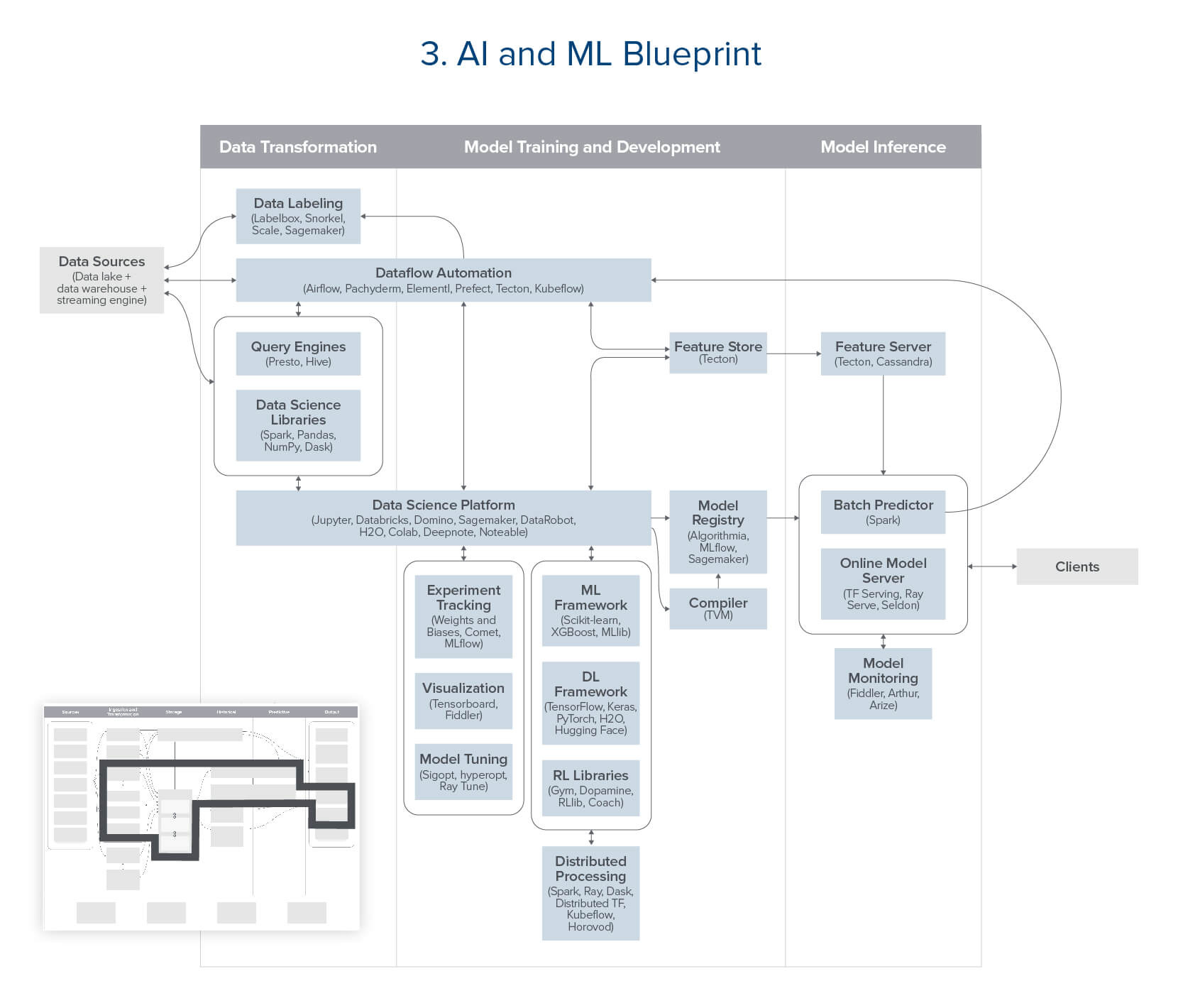 The strength of this approach – as opposed to pre-packaged ML solutions – is full control over the development process, generating greater value for users and building AI/ ML as a core, long-term capability. This blueprint is less appropriate for companies that are only testing ML, using it for lower-scale, internal use cases, or opting to rely on vendors – doing machine learning at scale is among the most challenging data problems today.