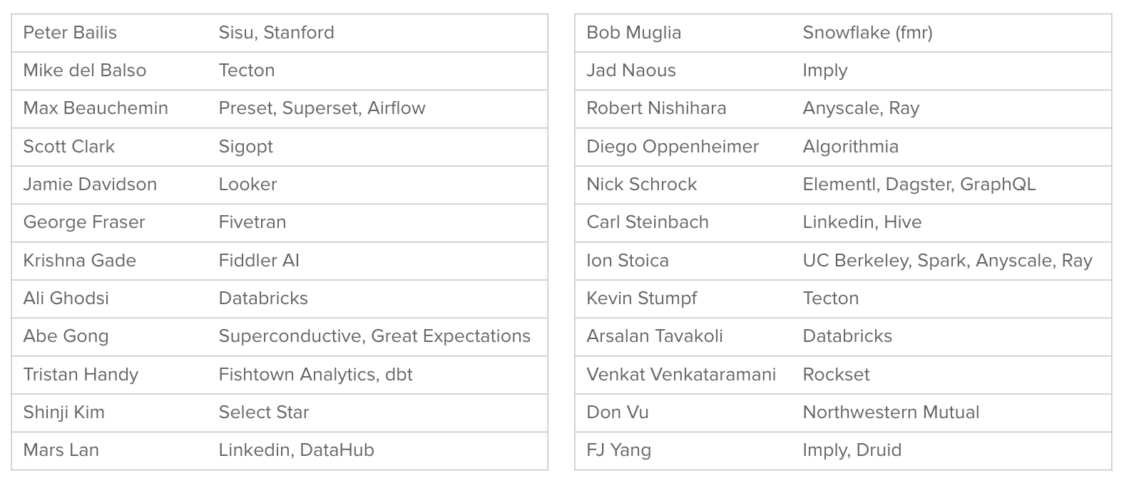 This report contains data infrastructure reference architectures compiled from discussions with dozens of practitioners. Thank you to everyone who contributed to this research!