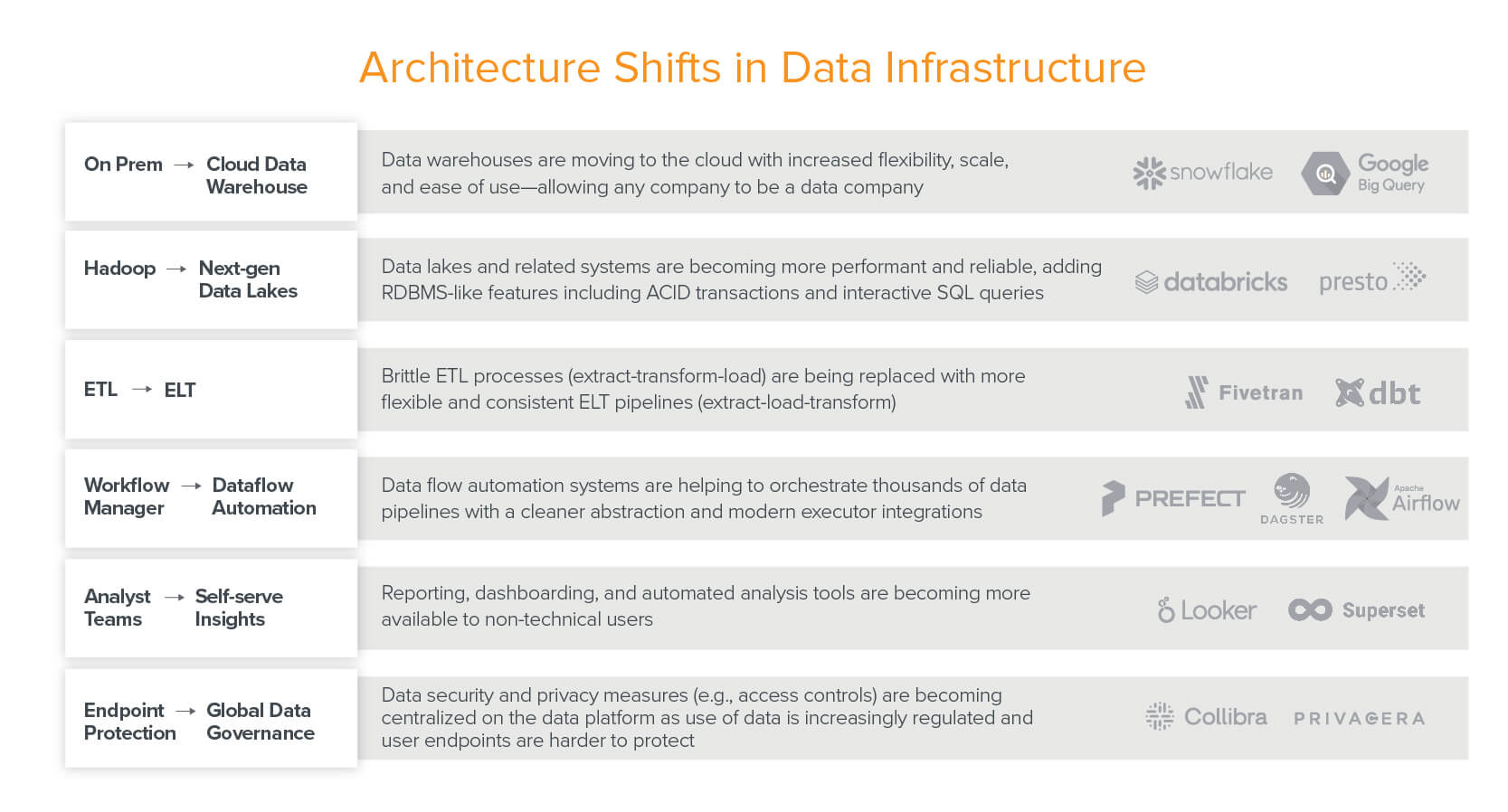 Data infrastructure is subject to the broad architectural shifts happening across the software industry including the move to cloud, open source, SaaS business models, and so on. However, in addition to those, there are a number of shifts that are unique to data infrastructure. They are driving the architecture forward and often destabilizing markets (like ETL tooling) in the process.