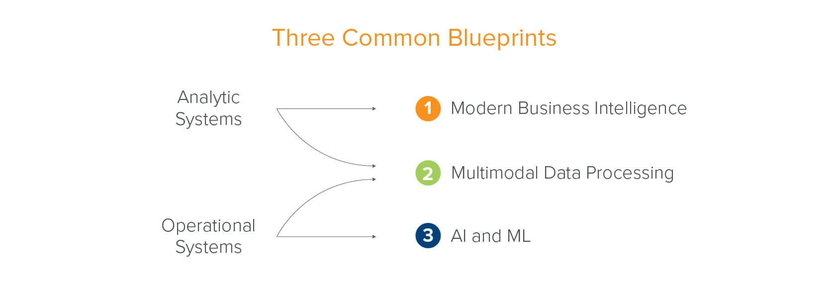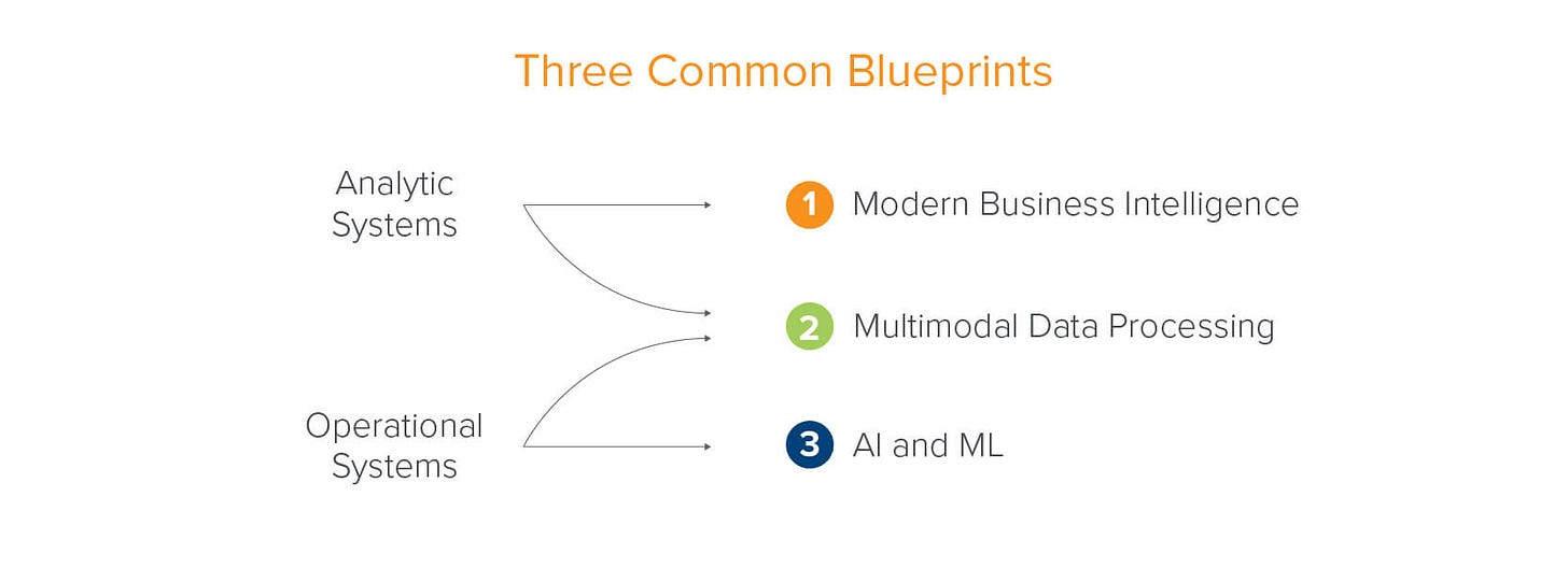We’ll provide a high-level overview of three common blueprints here. We start with the blueprint for modern business intelligence, which focuses on cloud-native data warehouses and analytics use cases. In the second blueprint, we look at multimodal data processing, covering both analytic and operational use cases built around the data lake. In the final blueprint, we zoom into operational systems and the emerging components of the AI and ML stack.