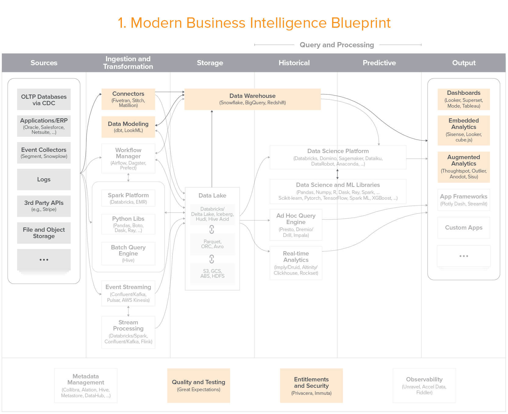 This is increasingly the default option for companies with relatively small data teams and budgets. Enterprises are also increasingly migrating from legacy data warehouses to this blueprint – taking advantage of cloud flexibility and scale.