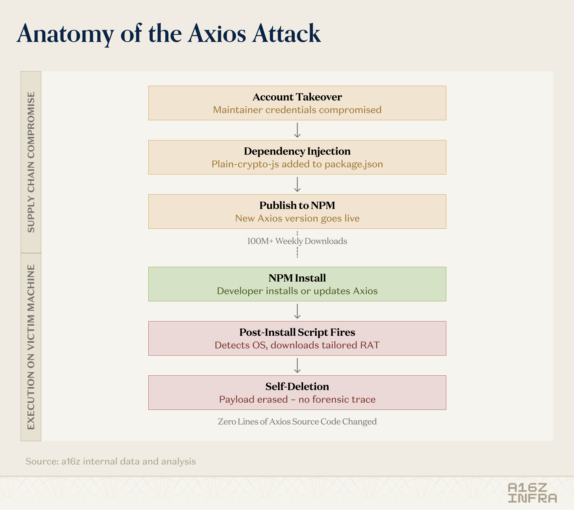 When an attacker compromises one node in that graph, they don’t need to target you specifically. Every npm install during the exposure window is a potential victim. The Axios attacker didn’t need to know who you are or what you built. They compromised the foundation of the ecosystem and waited for it to collapse.
