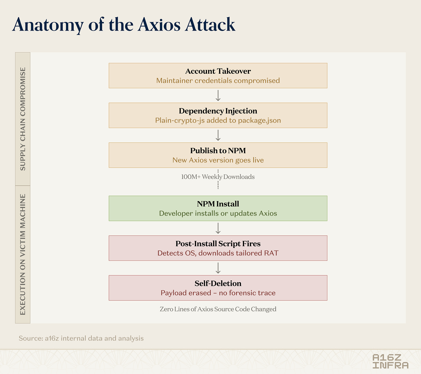 Socket, an a16z portfolio company, detected the malicious dependency in the Axios attack within 6 minutes of its publication. That’s roughly 63,000 times faster than the industry average. They flagged it 16 minutes before the first compromised Axios version was even published, because they caught the suspicious dependency package itself.