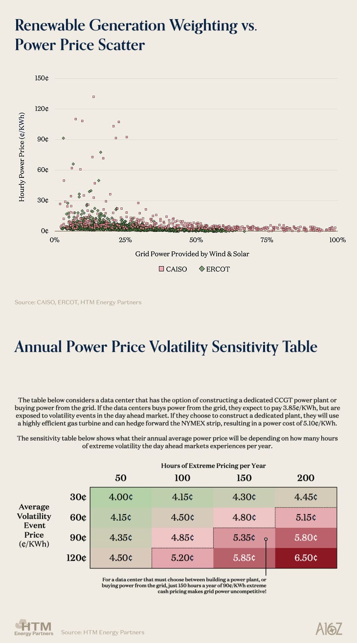The charts above consider the “edge cost” of relying on intermittent power generation. The left chart shows a scatter where each point is one hour of real grid operation, emphasizing power prices retain massive tail risk to periods of low contributions from wind and solar generation, while the right table considers how much volatility intermittent generation can bear before losing to CCGT LCOE, quantifying the cost & reliability trade offs of grid vs. BTM.