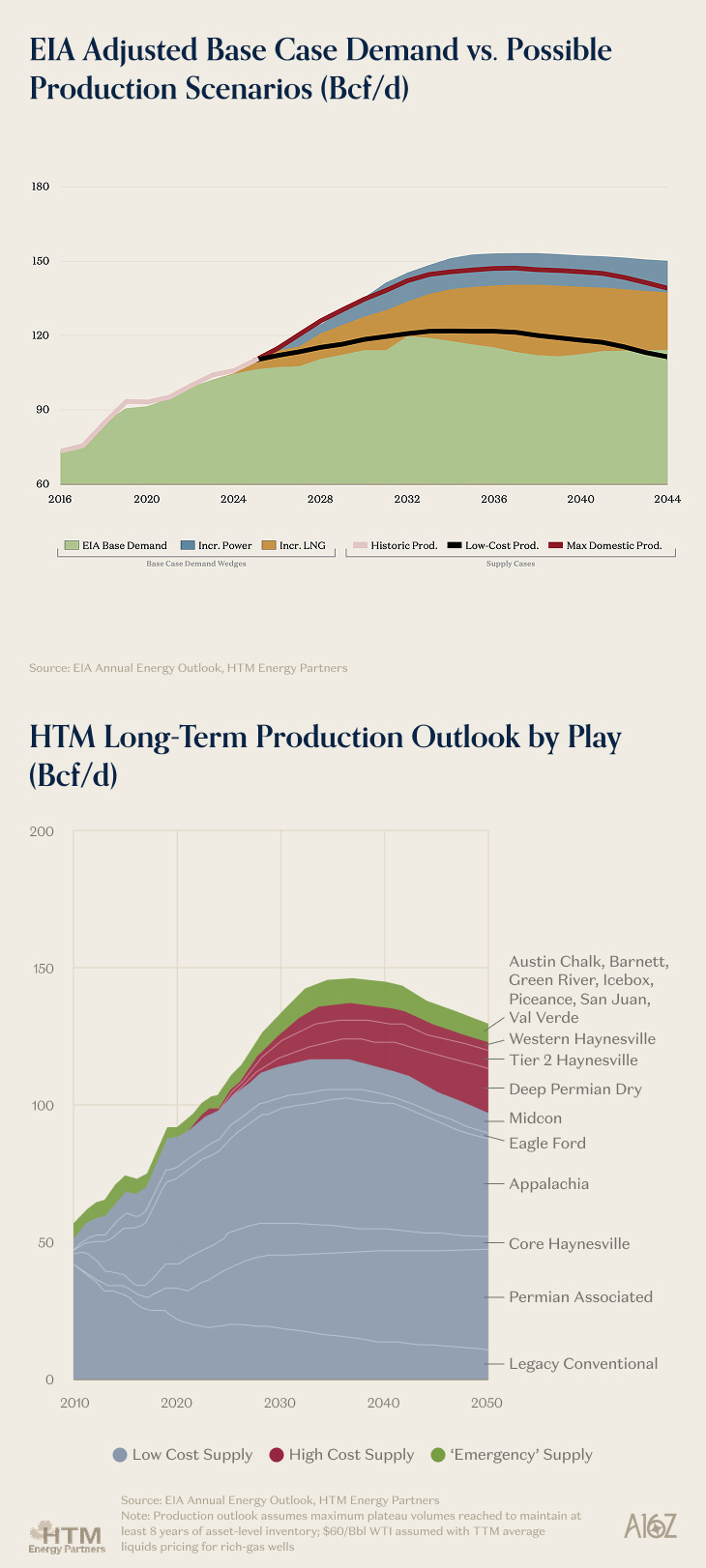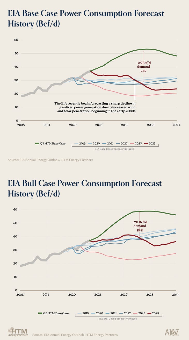 Take, for example, the forecast consumption of natural gas for power generation. As of April 2025, the EIA assumed that, in their upside case, demand for natural gas to generate electricity would grow ~10% through 2032, then begin declining. Their base case is even worse – with demand declining beginning in 2026. Anyone that uses the EIA domestic consumption forecast would be understating power demand. The current outlook for gas-fired power demand is a fully incremental ~10-12 Bcf/d for data centers and minor coal retirements, with no abrupt decline in the early-2030s. At the very least, it would be safe to assume that power consumption won’t be declining in the 2030s (which requires ~12 Bcf/d of production to stay online for 15 years – that’s 50 Tcf of gas, more than EQT has!)