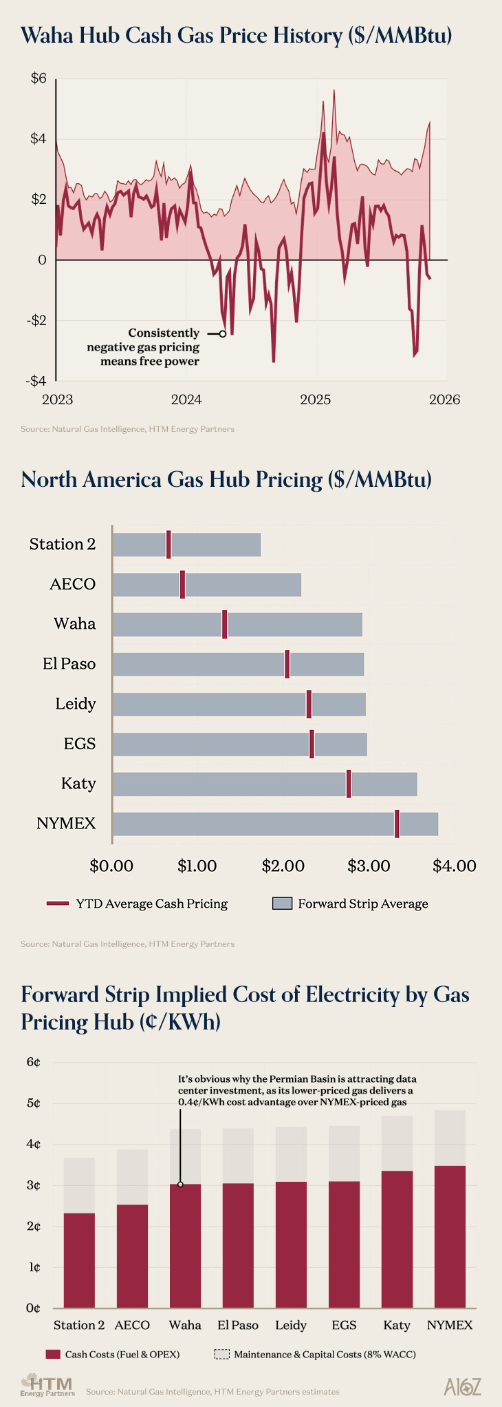Because the capital cost of the gas turbines themselves make up a tiny part of CCGT’s LCOE, in areas like the Permian Basin, where gas prices have been structurally $2-3/MMBtu cheaper than NYMEX, and are frequently negative – gas-fired power can have negative cash costs, and LCOE can be as low as ~4¢/KWh. So it makes sense why massive AI campuses have chosen wide-open West Texas as their ideal site. Pipelines sprawl throughout the area, land isn’t arable, permitting is easy, and gas is abundant. The only cheaper gas on the continent is in Canada, but who would ever want to go there (spoiler: people should want to go there). As data center demand in the Permian has continued to line-up, and egress from the basin grows, Waha prices (Permian gas prices) have tightened considerably, now priced just a few cents below with other Texas, and even Appalachian benchmarks trade at, though still cheaper than Henry Hub.
