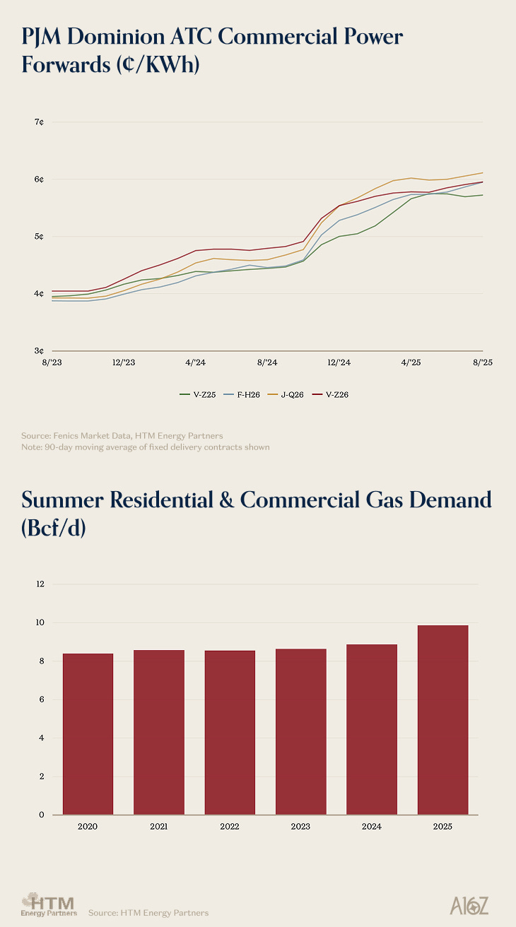 The charts above show the measurable impact of AI on power prices (left), and natural gas consumption (right). For those looking where behind the meter gas consumption shows up, it’ll be in residential and commercial demand – which is up ~1 Bcf/d y/y when adjusted for weather.