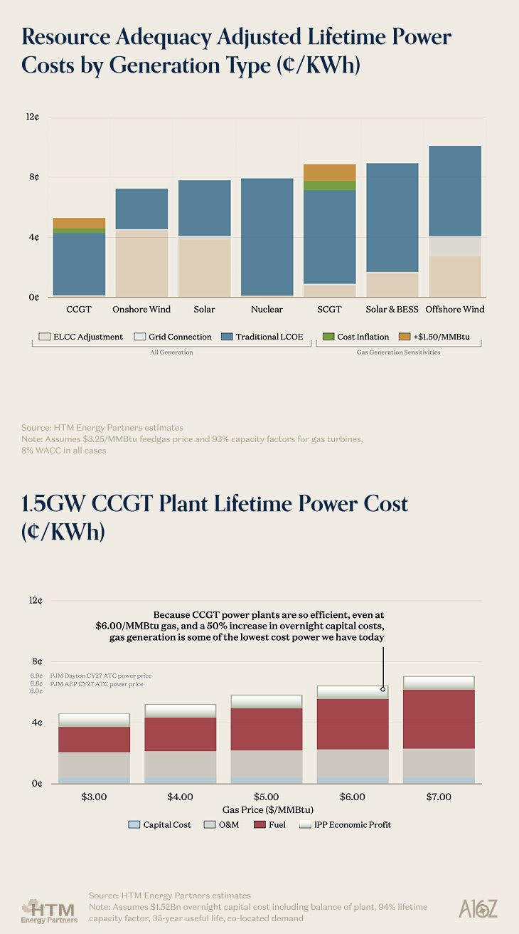 Renewable power is great, because it has almost no marginal cost. This will play an important role in defining AI’s “token cost curve”, but gas generation is fantastic because it’s just so cheap. There’s no other way around it – it’s a known fact today that we can generate electricity at a LCOE of ~5¢/KWh, and with cash costs of ~3.3¢/KWh when using highly efficient combined cycle gas turbines. If gas generating capacity is co-located with the large load it serves, there is nothing that competes with it, even if gas prices begin to increase. It may seem like the fixed ~3.3¢/KWh CCGT cash costs could never compete with the ~0.05¢/KWh cash costs of solar panels – but it does, and that’s because the cash marginal cost of CCGT power (at fixed gas) is always ~3.3¢/KWh, and it’s always there.