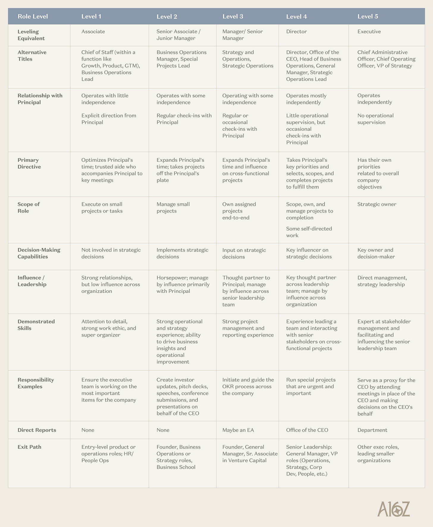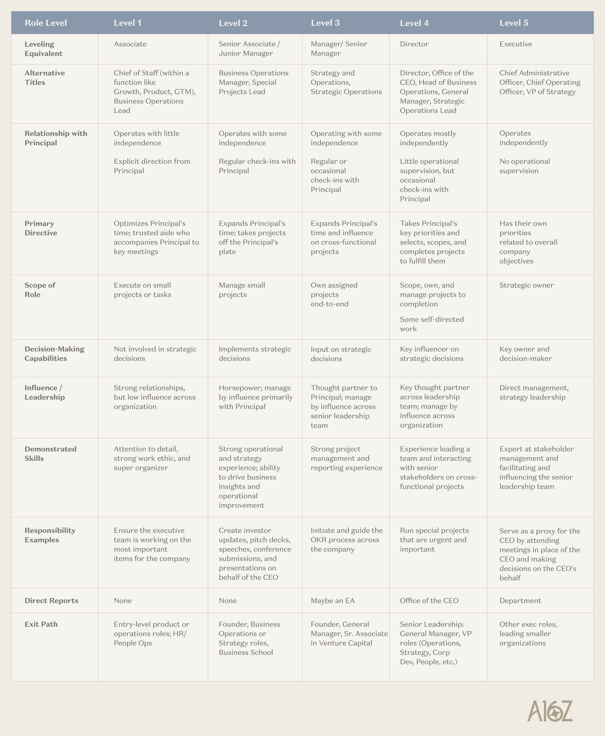 Level 5 is typically an outlier for Chief of Staff roles, especially at early-stage startups. In the table below, you’ll discover more about the scope. While a Level 5 CoS carries greater responsibility, they’re ultimately responsible for a portion of the organization—not acting as a CEO proxy in a management role. C-suite leaders should report directly to the CEO, and lines shouldn’t be blurred.
