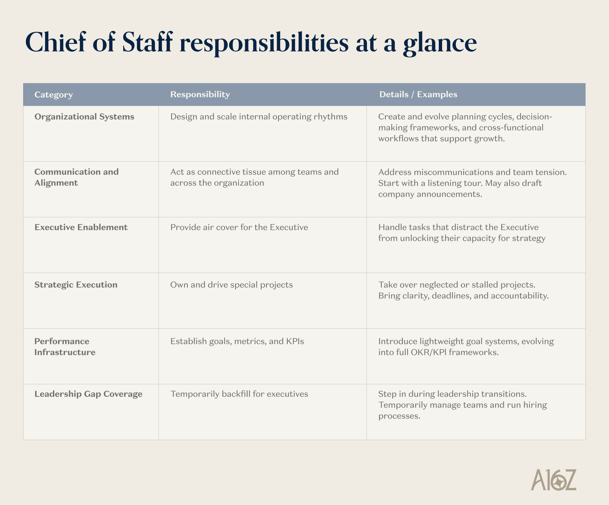 Serving as connective tissue across teams. There may be miscommunications or even conflict in your startup. A strong CoS identifies these problems and addresses them head-on through a diplomatic, tactical, and empathetic approach. This may start with a listening tour, which we suggest doing during onboarding.