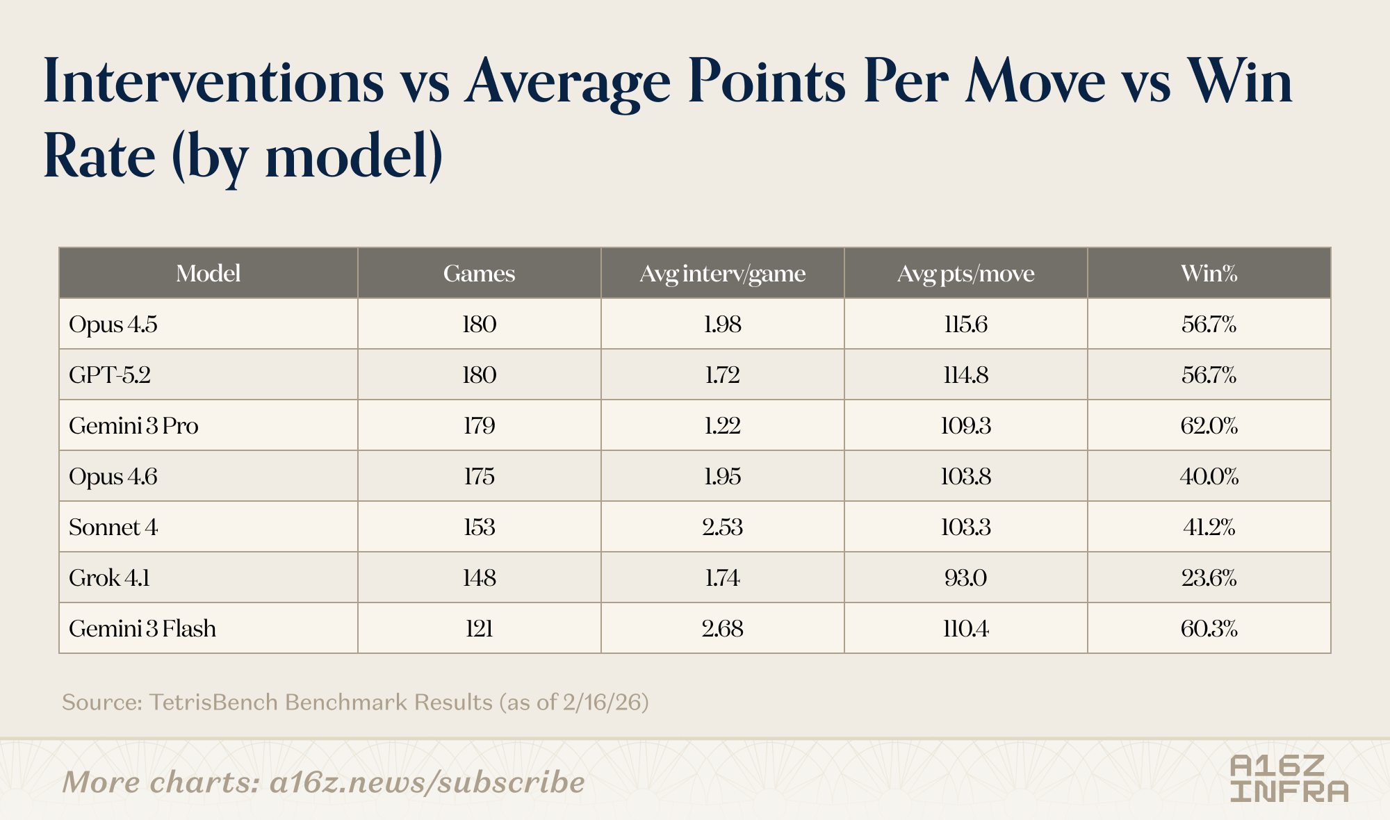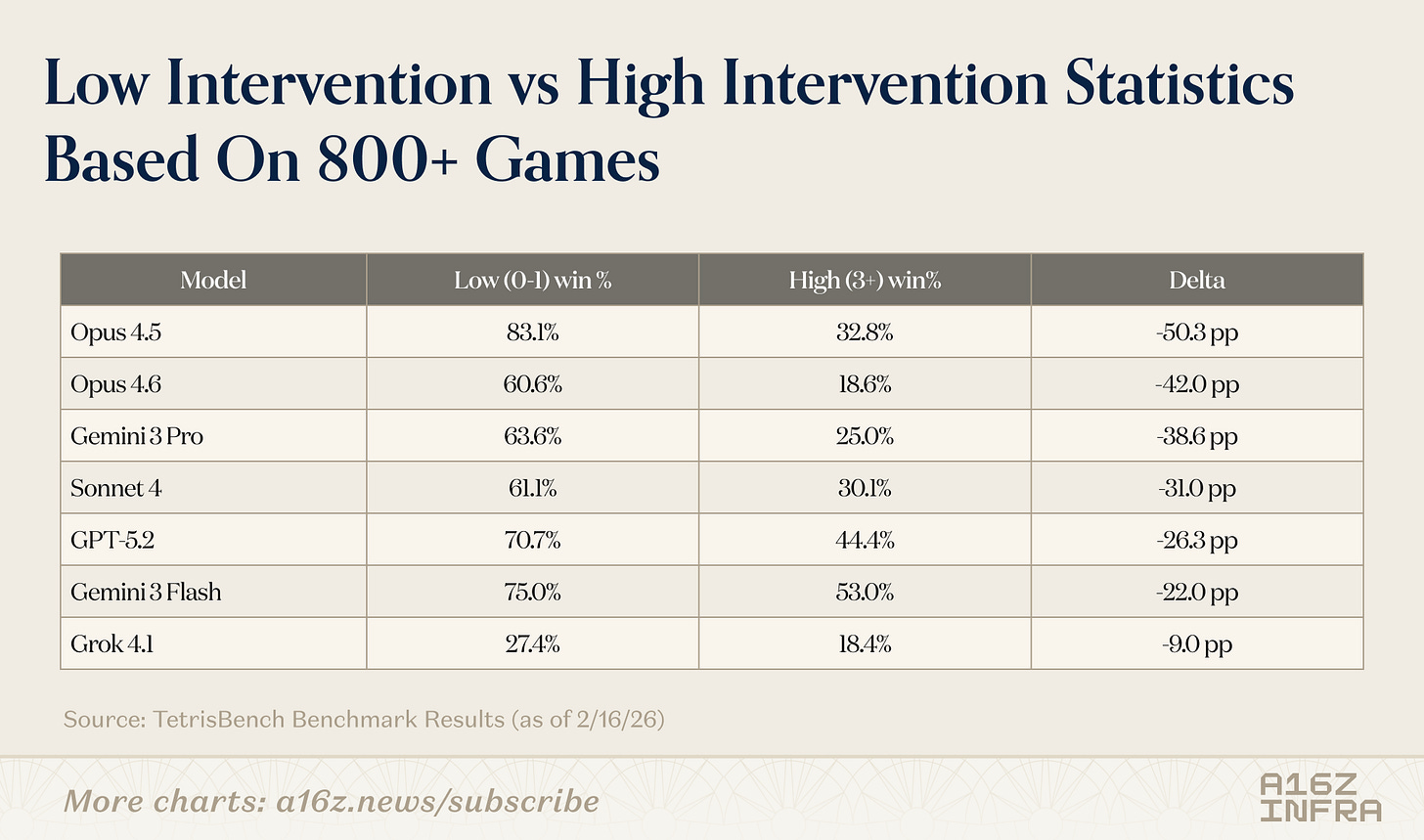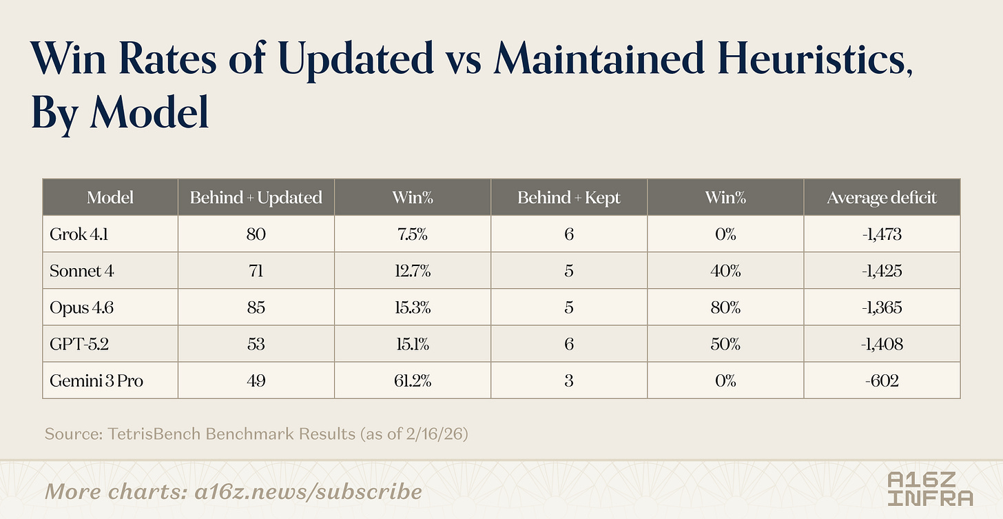 If you’re thinking about benchmarks for planning, coding agents, or long-horizon model behavior, I’d love to chat. You can find the TetrisBench project here. If you’re interested in the full data and trajectories generated from this benchmark or want to explore related analyses, feel free to reach out at yli@a16z.com.