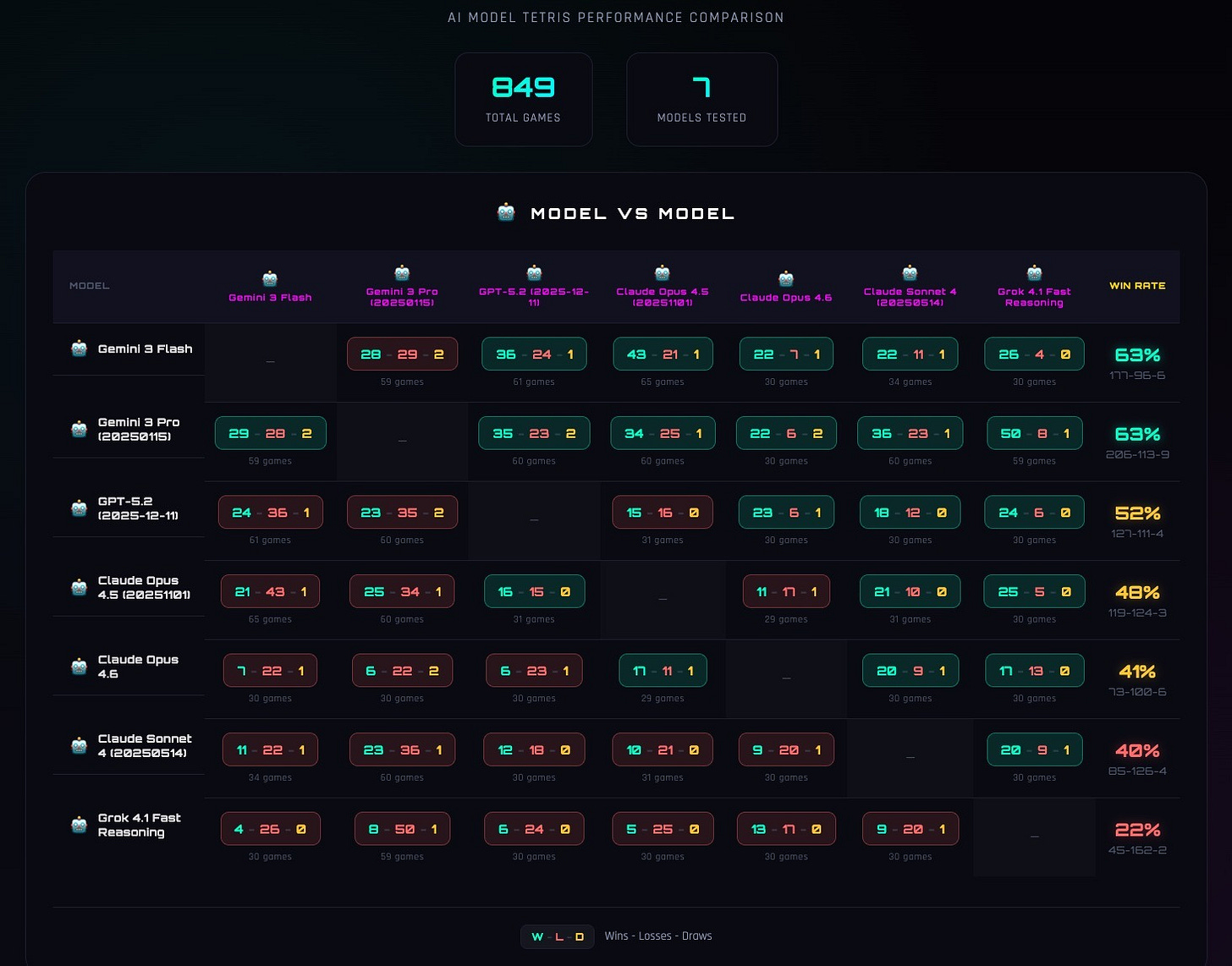 So I started running model-vs-model matches at scale. Same piece sequence. Same constraints. Same execution loop. The only variable was the model. I ran hundreds of games per pairing and logged everything.