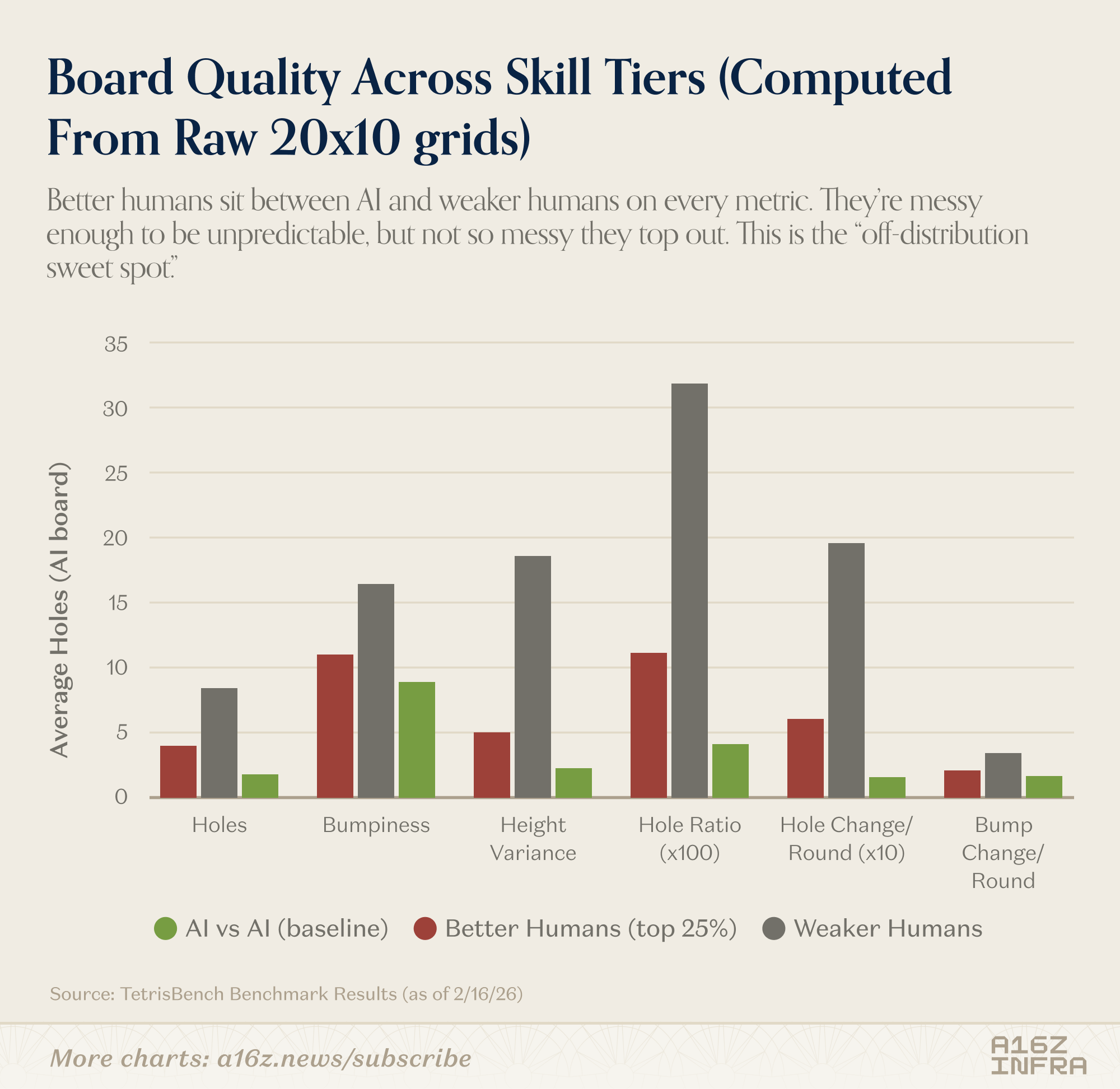 The board quality metrics reinforce this. Humans who are weaker on Tetris produce chaotic boards. Models produce very clean boards. But the strongest humans sit in between: not perfectly clean, not reckless either. They introduce controlled irregularity. That “off-distribution sweet spot” seems to be where models struggle the most.